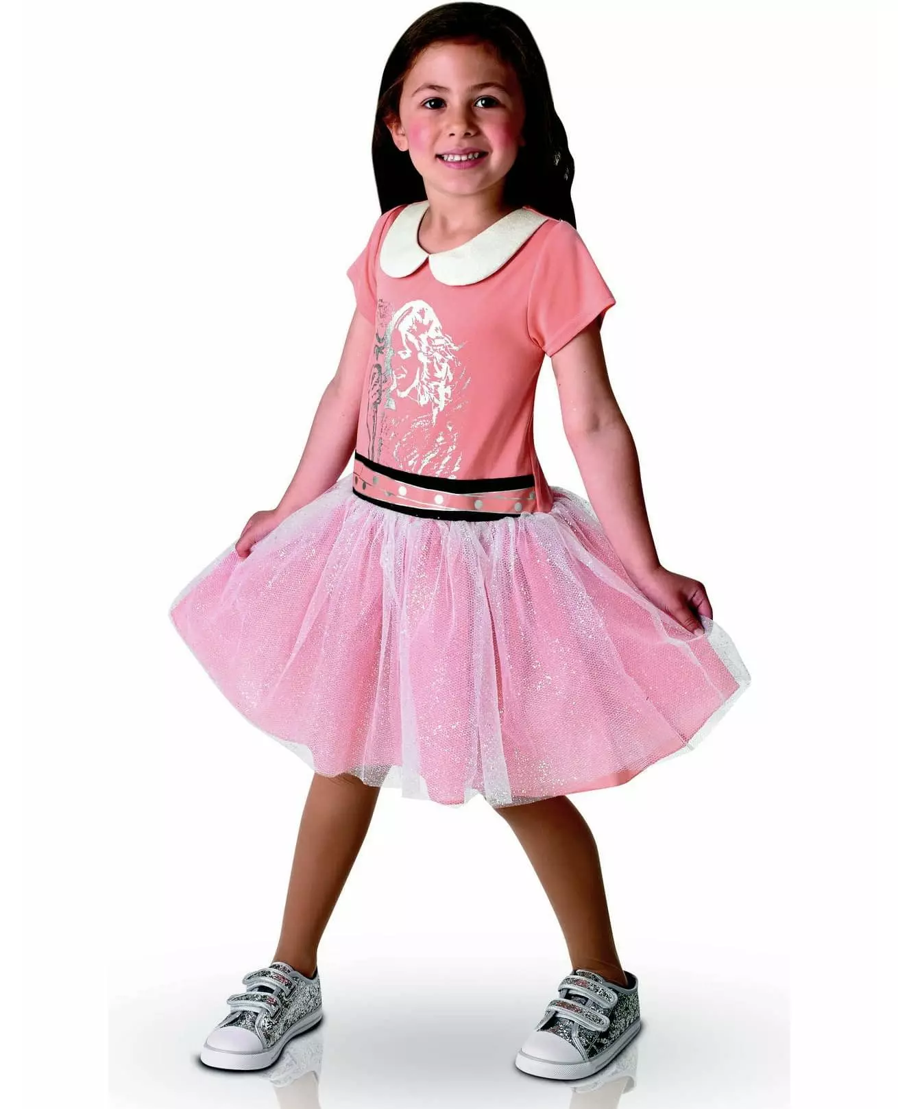 Gå inn i Violettas sko Dette Violetta™-kostymet for jenter er offisielt lisensiert av Disney™. Det består av en kjole (sko ikke inkludert). Denne kortermede kjolen er laget av et gammelrosa stoff, med en hvit paljettbesatt Peter Pan-krage. Violettas portrett er flokket i sølv på bysten. Nederdelen av kjolen er toppet med hvit paljettyll. Denne kjolen er enkel å ta på seg, uten lukking. Dette Violetta-kostymet vil være perfekt for å sette deg inn i idolets sko til karnevalet. Inkludert tilbehør: Kjole Materiale: 100 % polyester Pleie: Håndvask