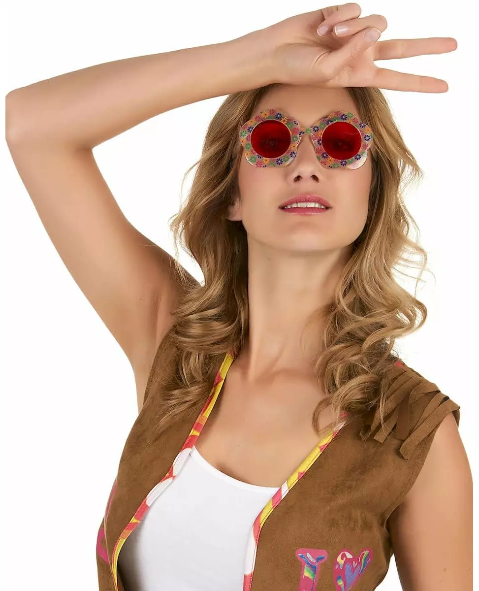Lenge leve 60-tallet! Disse fantastiske blomsterformede hippiebrillene er for voksne. De har en hvit innfatning med halvugjennomsiktige flerfargede blomster som omgir fargede linser. Hele greia er laget av plast. For en fullstendig "Flower Power"-stil er disse brillene laget for deg! Inkludert tilbehør: Briller Materiale: Plast