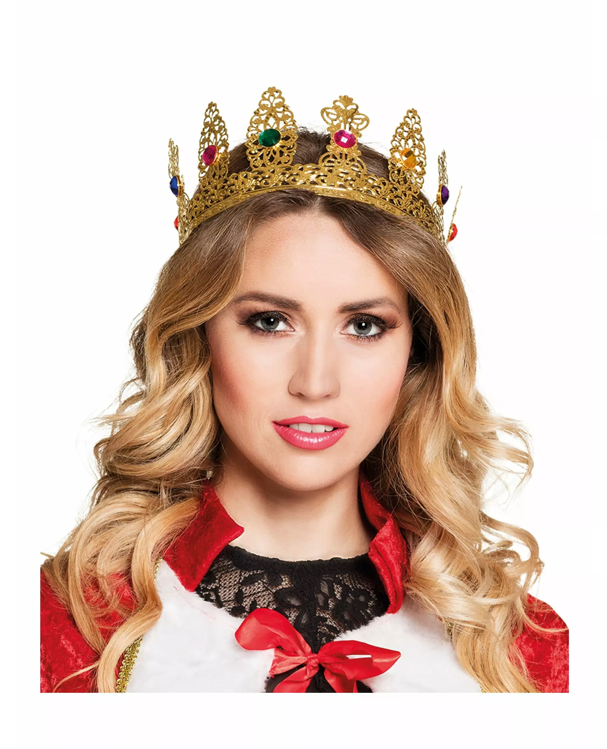 En vakker krone! Denne dronningkronen er for kvinner. Den er laget av fint gullfarget metall. Den har blå, røde, lilla og grønne kunstige edelstener. Den har en hodeomkrets på omtrent 52 cm. Denne kronen vil være perfekt for å fullføre ditt middelalderske dronningantrekk. Inkludert tilbehør: 1 krone Materiale: Metall