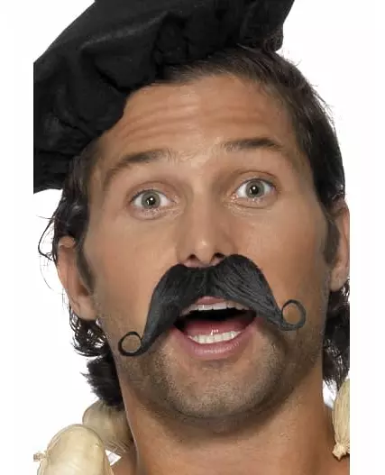 Fransk stil! Denne barten er svart med krøllete effekter i endene. Denne franske barten vil være det perfekte komplementet til kostymet ditt til karneval eller under kostymefester.