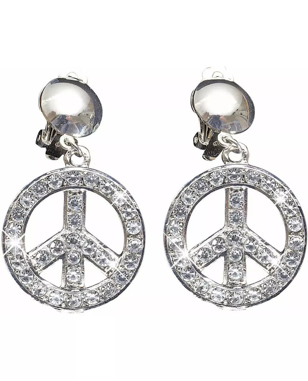 Gjenopplev Woodstock-årene med disse hippie-øredobbene. Disse hippie-øredobbene er for voksne. Metalliske, sølvfargede og utsmykket med skinnende strass-stener. De representerer fred- og kjærlighetssymbolet og lukkes med en klips. Fred- og kjærlighetssymbolet måler omtrent 2,5 cm i diameter. Disse hippie-øredobbene vil være perfekte som tilbehør til hippiekostymet ditt på en Woodstock-fest eller med et 60-tallstema. «Copyright Widmann SRL». «Copyright Widmann SRL. Inkludert tilbehør: 2 øredobber Materiale: Sink og stål.