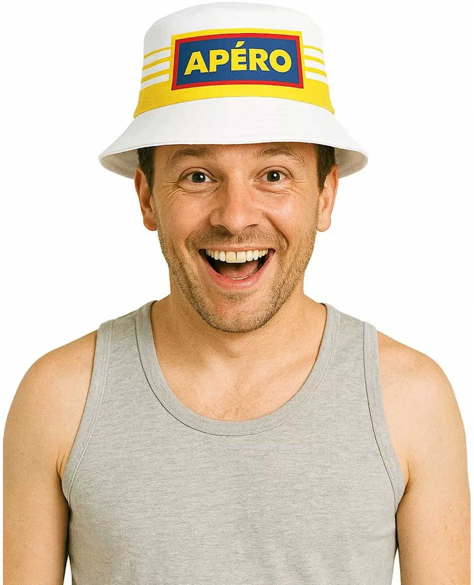 Aperitifftid! Denne aperitiffhatten er for voksne. Formet som en bøttehatt, er den hvit med et gult stripete trykk. Den har påskriften «Aperitiff» med gule bokstaver på en blå bakgrunn. Vær klar for aperitiff under alle omstendigheter med denne aperitiffbøttehatten!. Inkludert tilbehør: Bøttehatt Materiale: 100 % polyester Stell: Håndvask