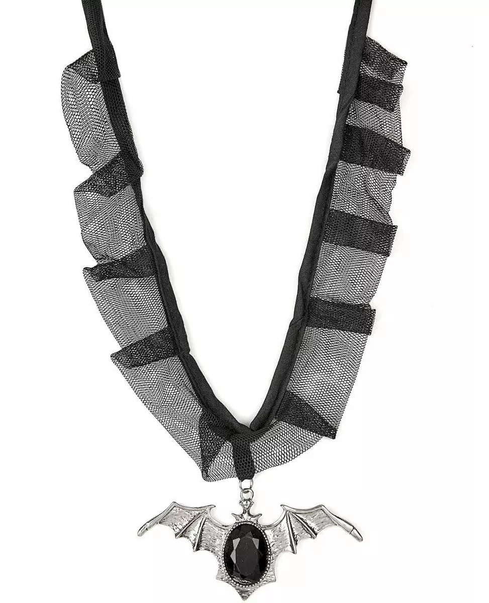 Fullfør ditt gotiske antrekk med denne originale chokeren. Denne damechokeren er laget av svart slør. Et grått metallisk flaggermusformet anheng er plassert i midten av halskjedet. En imitert svart stein pryder flaggermusens mage. Halskjedet måler 72 cm langt og festes med to svarte bånd. Flaggermusen måler 9 cm langt og 5 cm høyt. Denne chokeren vil være perfekt for å fullføre et vampyrgrevinne- eller gotisk kostyme til en kostymefest med venner eller for å feire Halloween. «Copyright Widmann SRL». «Copyright Widmann SRL. Inkludert tilbehør: Choker Materiale: 70 % polyester, 25 % sink, 5 % akryl