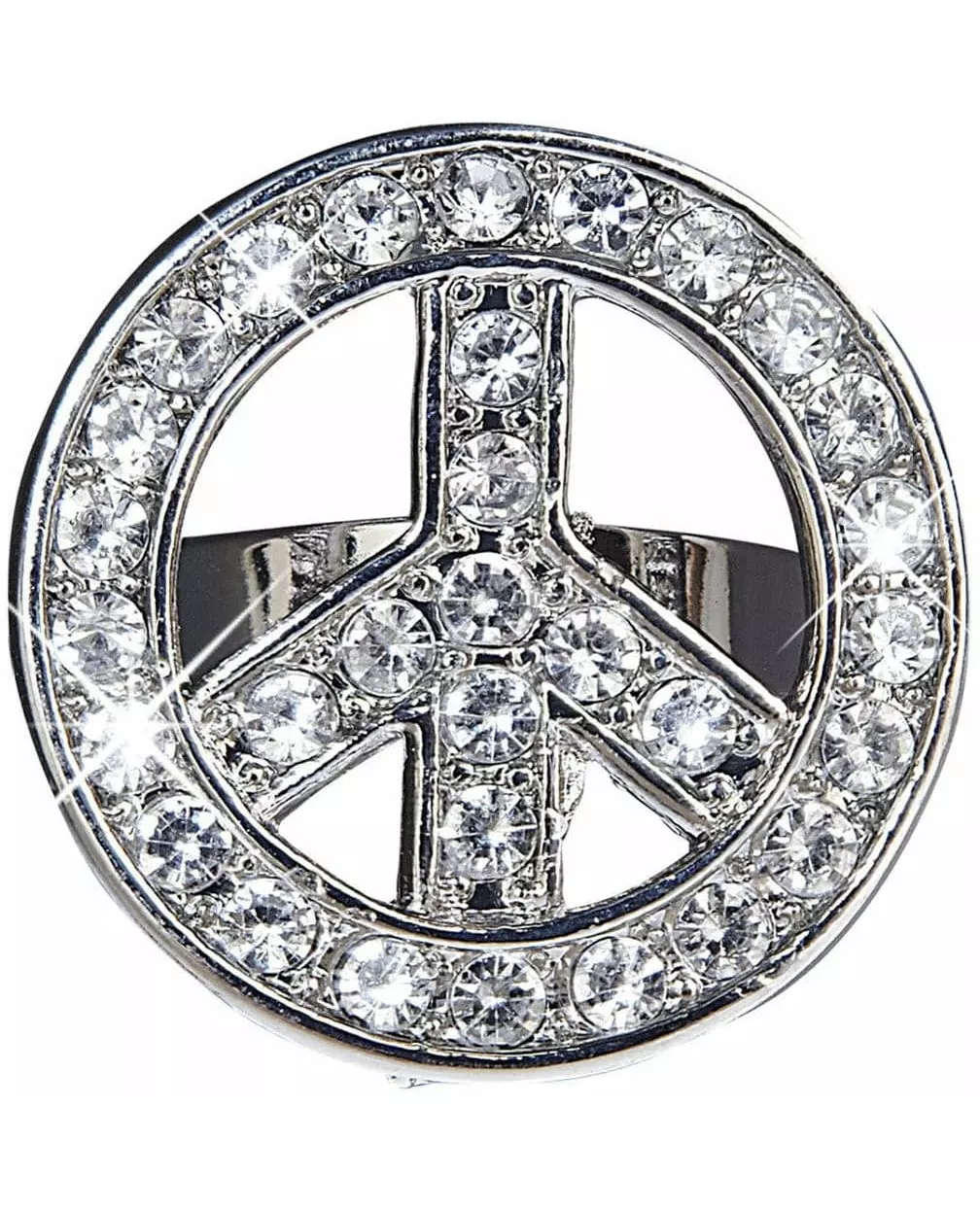 Dykk ned i hippieverdenen! Denne hippieringen med strass er for voksne. «Fred og kjærlighet»-tegnet er dekket av strass og har en diameter på 2,5 cm. Denne justerbare ringen passer enkelt. Dette smykket er ideelt for å fullføre antrekket ditt til en fest med 60-tallstema. «©Copyright Widmann SRL» ·©Copyright Widmann SRL. Inkludert tilbehør: Ring