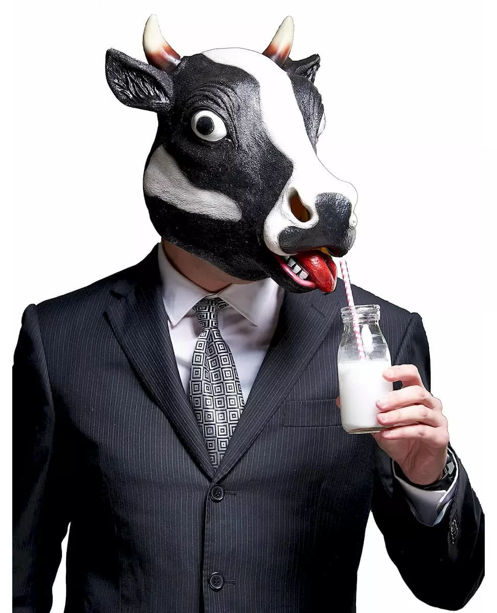 Få vennene dine til å mumle Denne voksenmasken forestiller en tofarget ku. Kua er laget av lateks, og den svarte og hvite fargen er veldig realistisk. Håret og pigmentene på snuten er simulert av malingen. To små horn er festet til hodeskallen. De store, litt skjeve øynene og den skinnende, røde, utstående tungen gir denne kua et komisk utseende. Det er åpninger i neseborene og munnen på kua. Gi kostymefester eller til og med Halloween en humoristisk tone med denne morsomme kumasken. Inkludert tilbehør: Helmaske Materiale: 100 % lateks