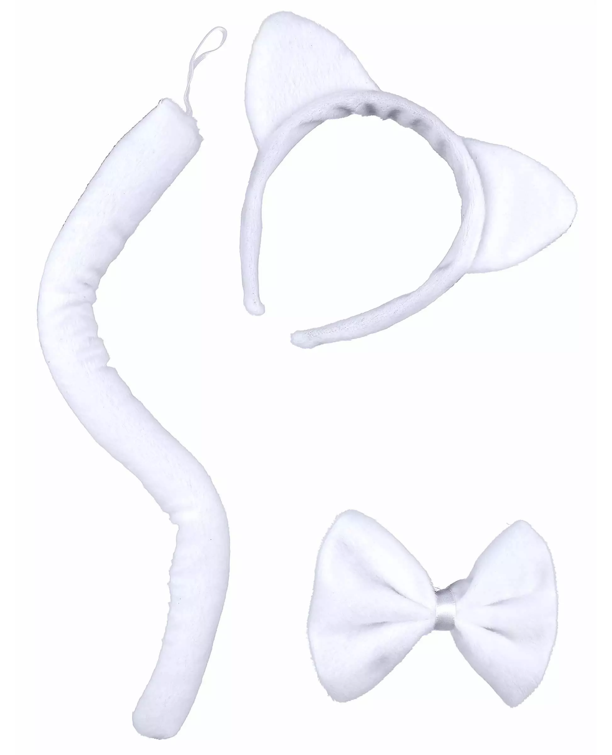 Purr Dette hvite kattesettet for voksne inkluderer et par ører, en sløyfe og en hale (body ikke inkludert). Alle elementene er laget av tykt, mykt stoff som minner om fleece. Ørene holder seg perfekt på plass fordi de er montert på et pannebånd. Sløyfen og halen er utstyrt med elastikk. Dette settet vil være ideelt for å leke tag på Valentinsdagen eller til og med på karneval! Inkludert tilbehør: Pannebånd Sløyfe Hale Materiale: 100 % polyester