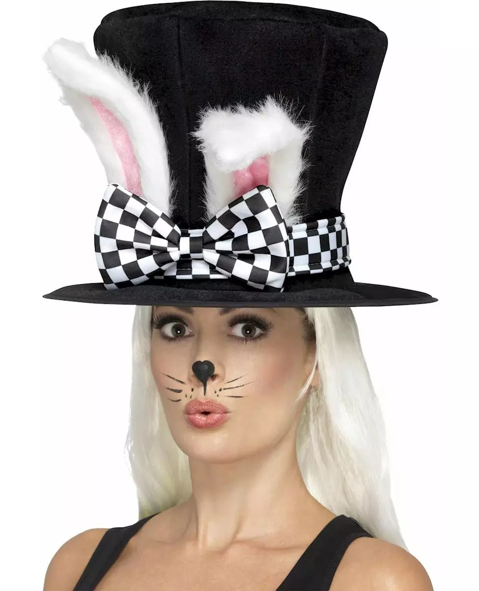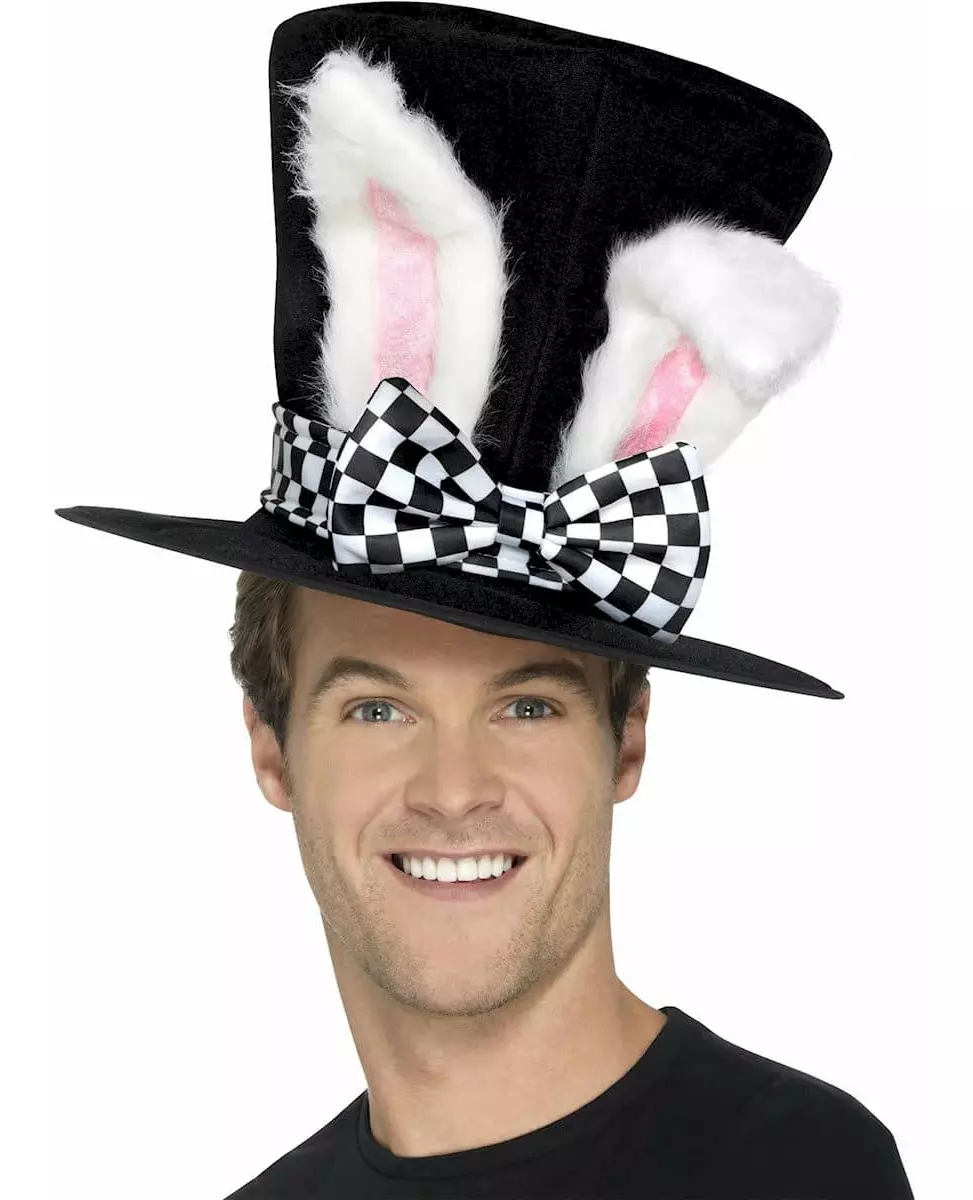 Ideell for magiske triks! Denne flosshatten med kanin er for voksne. Den er laget av polstret stoff med svart fløyelseffekt. Den er dekorert med to store, pelskledde kaninører og et svart-hvitt rutete bånd som danner en stor sløyfe foran. Denne overdimensjonerte hatten vil være perfekt for å leke hattemakerkanin på karnevalet! Inkludert tilbehør: Hattmateriale: 100 % polyester 100 % polyester