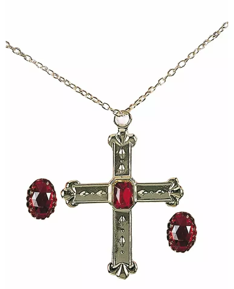 Vakker imitasjon! Dette kardinalsettet inneholder to store gullringer besatt med røde steiner, en kjede og et gullfarget kors, svært forseggjort dekorert med en rød stein. Ringene og halskjedet er justerbare for større komfort. Kjeden måler omtrent 75 cm lang. Et komplementært tilbehør til kostymefester. «Copyright Widmann SRL». «Copyright Widmann SRL.»