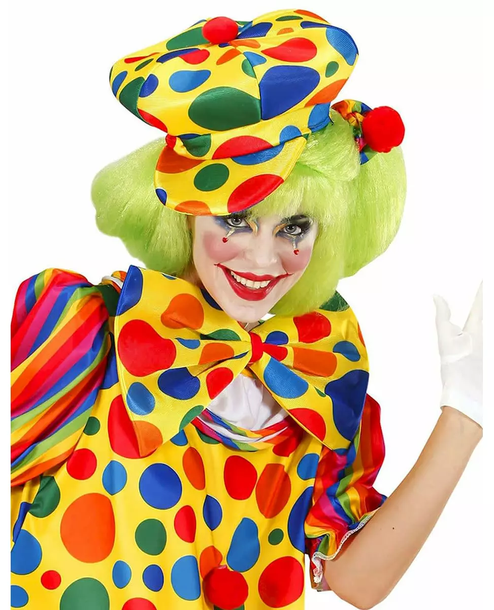 Legg til litt farge i klovnekostymet ditt Denne gigantiske klovnebaskeren for voksne er gul. Den er laget av farget skum trykt med røde, oransje, grønne og blå polkaprikker. Den har en rød pompong på toppen av hodet. Denne hatten har en hodeomkrets på omtrent 62 cm. Dette tilbehøret vil være perfekt for å fullføre et klovnekostyme for en sirkustema-kveld eller for å feire karneval. «Copyright Widmann SRL». «Copyright Widmann SRL. Inkludert tilbehør: Baskere Materiale: 100 % polyester 100 % polyester