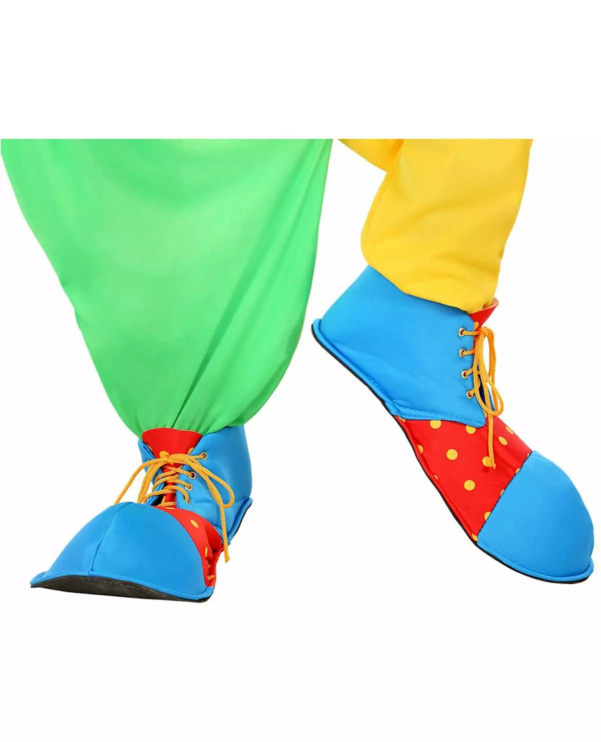 Bli en klovn med disse gigantiske skoene. Dette paret klovnesko måler omtrent 36 cm. Disse gigantiske skoene er røde og blå, med fargede lisser. Disse skoene er perfekte for å sette prikken over i-en på klovnekostymet ditt til karneval eller en utkledningsfest. Originalitet og latter garantert! Inkludert tilbehør: 2 sko. Materiale: Stoff.