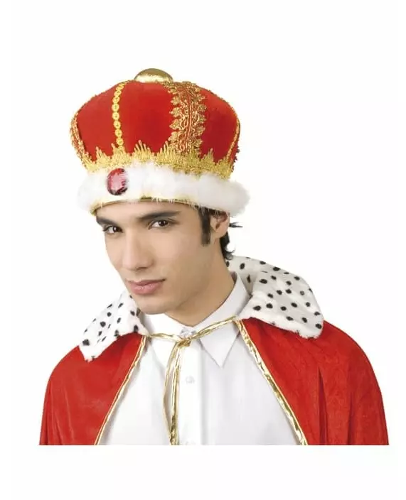 Kongelighet lett tilgjengelig! Denne kongehatten er rød. Den er dekorert med gullfarget kant og en stor pompong på toppen av hodet. Nederst på hodeplagget er hvite fjær limt til et gullbånd. Denne hatten vil være perfekt som tilbehør til et kongekostyme til en kostymefest eller til karneval. Inkludert tilbehør: Hodeplagg