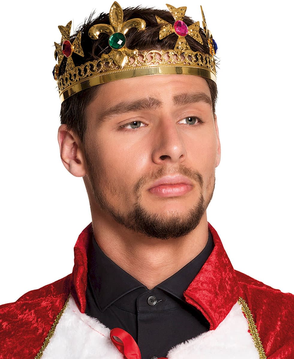Kongen vår er kjekk! Denne kongekronen i metall er for voksne. Den er gullfarget med falske juveler, grønn, rød, rosa og blå. Den har en hodeomkrets på omtrent 58 cm. Denne kongekronen av høy kvalitet vil være perfekt for å fullføre kongekostymet ditt til karnevalet. Inkludert tilbehør: Krone Materiale: Metall