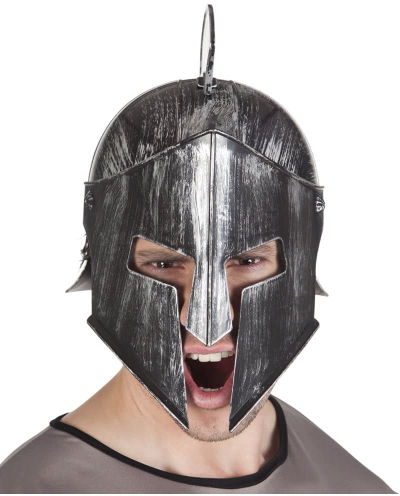 En ekte middelalderkriger. Denne hjelmen for voksne imiterer en ridder. Den er laget av plast og måler omtrent 20 cm. Den er børstet svart med sølvdetaljer. Et våpenskjold gir den et svært truende utseende. Delen i ansiktet er bevegelig. Den lar øynene og munnen være afdekket. Til et kostymefest med temaet krig eller middelalderhelter, bruk denne krigerhjelmen i tillegg til ringbrynje. Inkludert tilbehør: Hjelmmateriale: Plast Målinformasjon: Game of Thrones
