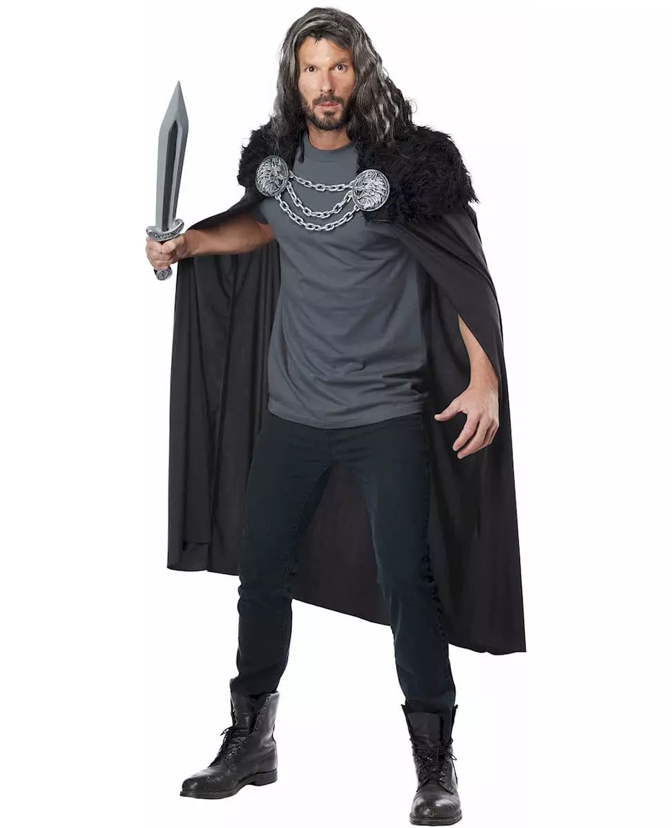 Bli en ekte kriger av Nord med denne krigerkåpen med ulvesymbol! Denne kåpen for voksne er lang og svart, den har svart pels rundt halsen og skuldrene (parykk, topp, bukser og sko er ikke inkludert). Den festes til halsen med en falsk metallkjede knyttet til to ulvesymboler. Denne kappen lar deg perfeksjonere et nordlig krigerantrekk, du kan for eksempel legge den til en rustning. Til Halloween vil du være klar til å kjempe mot iszombiene eller danne en sjokkduo med dragenes mor!. Inkludert tilbehør: Kappe Materiale: 100 % polyester Stell: Håndvask Mål: 130 cm lang