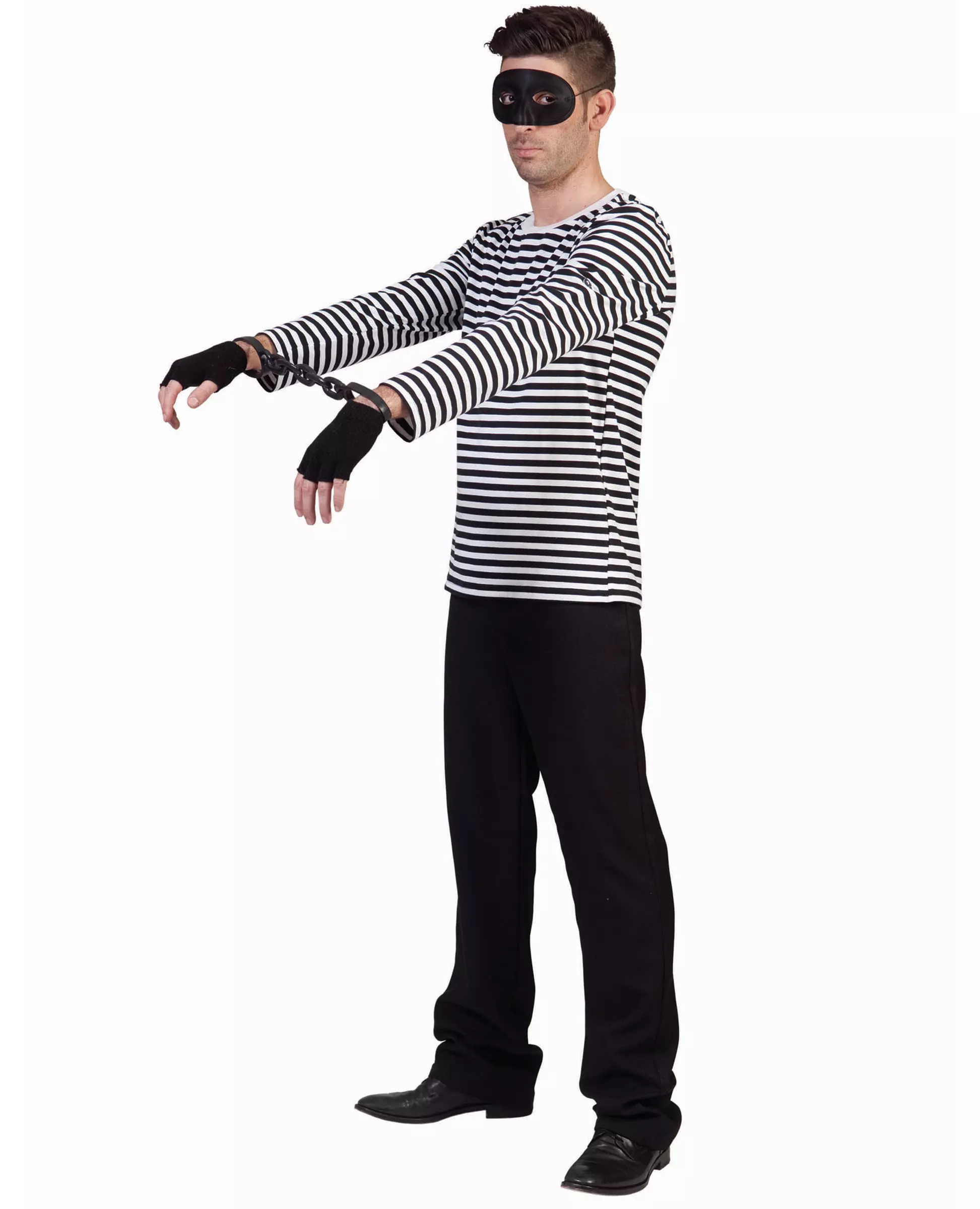 Mimen har talt! Denne mime-t-skjorten er for voksne. Den har lange ermer og er dekorert med svarte og hvite striper. Denne t-skjorten vil være perfekt for å fullføre mime- eller fangekostymet ditt til karnevalet. Inkludert tilbehør: T-skjorte Materiale: 100 % polyester Pleie: Håndvask