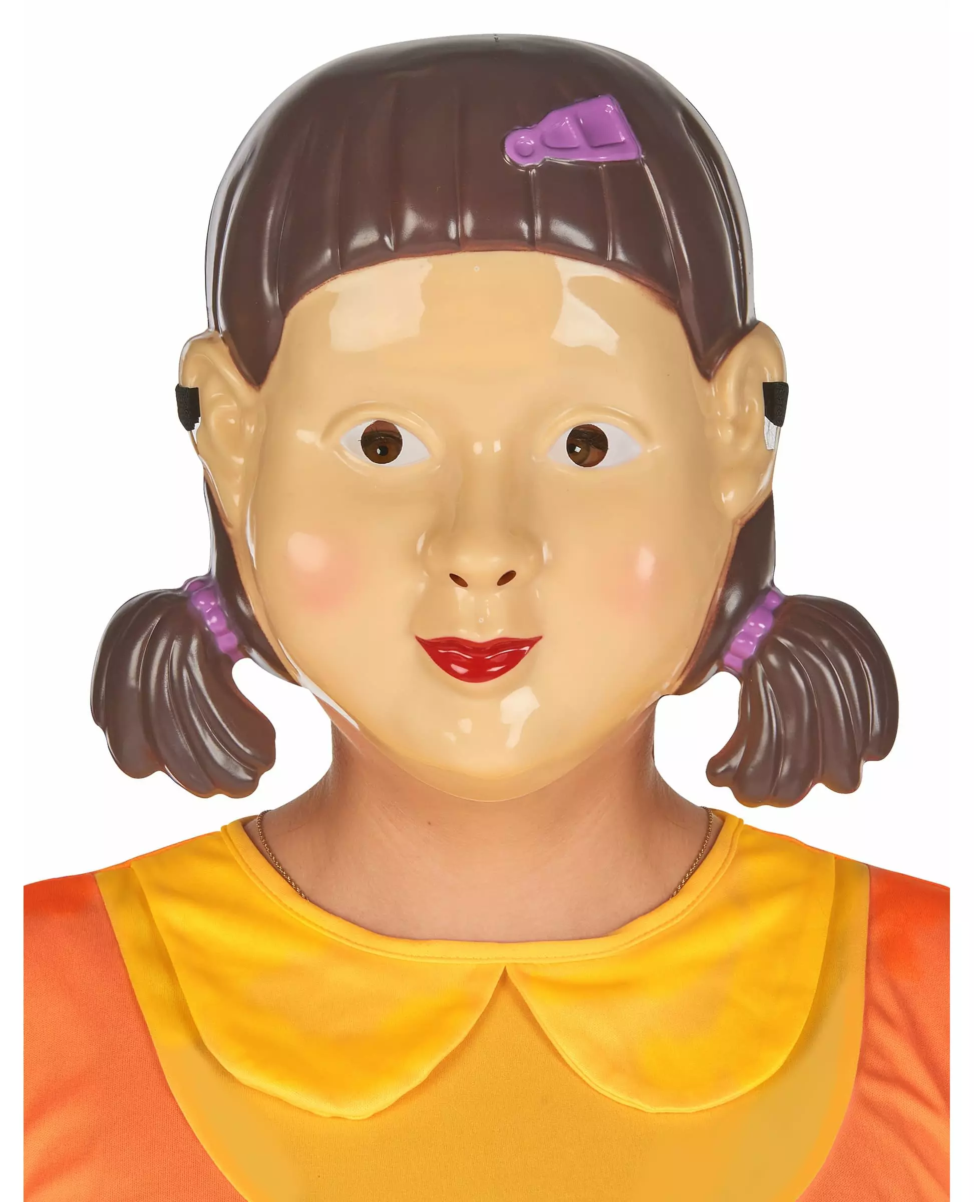 Legemliggjør den berømte morderdukken! Denne morderdukkemasken er for voksne. Masken er rund i formen, flat og kommer i brunt, beige, lilla og rødt. To hull er på øyehøyde for å sikre god synlighet når den brukes. Legemliggjør den berømte morderdukken fra din koreanske favorittserie til en kostymefest som Halloween, karneval eller nyttårsaften! Inkludert tilbehør: 1 maske Materiale: Plast Stell: Håndvask