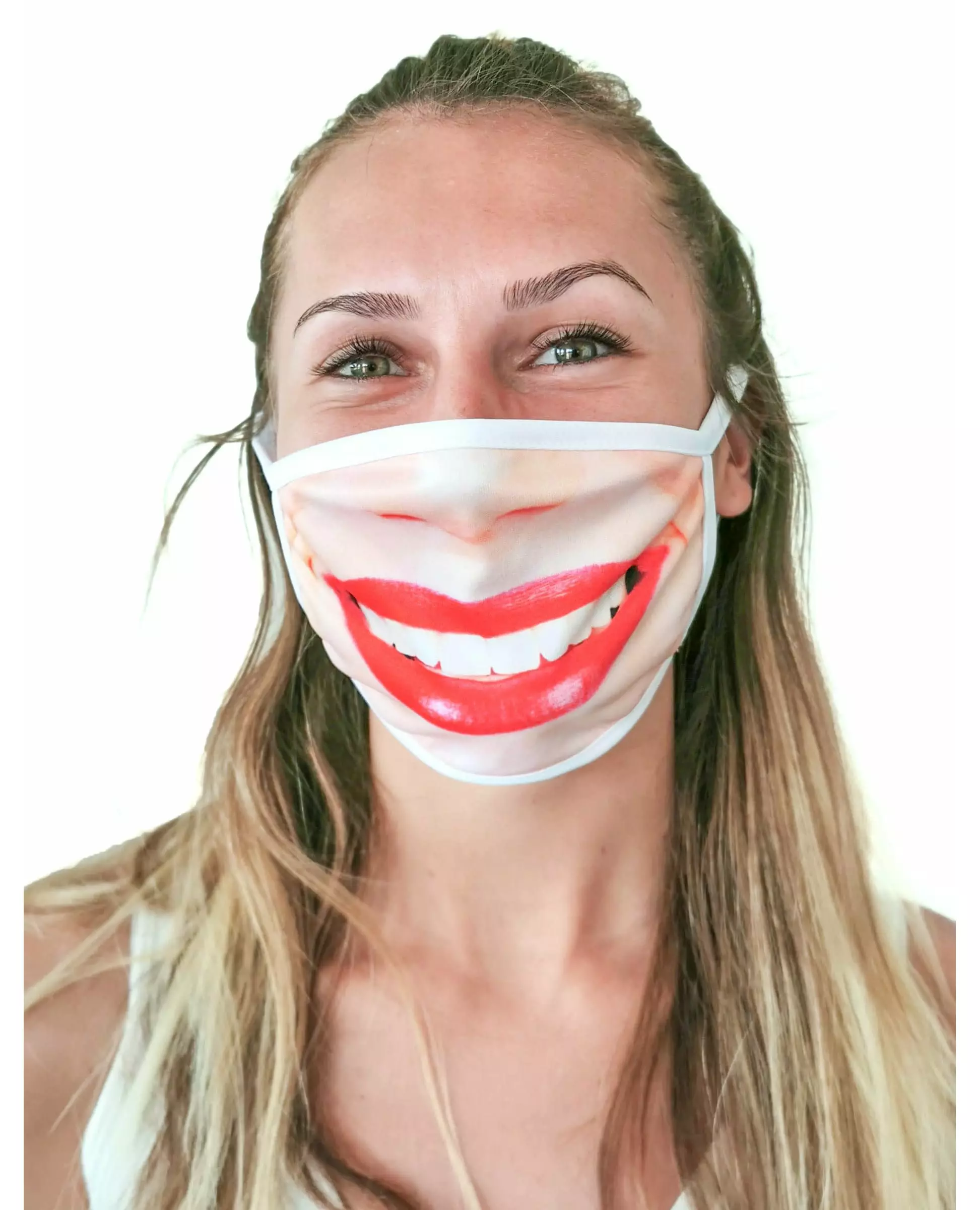 Vis frem et vakkert smil selv bak en maske. Denne voksenmasken er laget av stoff. Den er trykt med en smilende munn og en vakker rød leppestift. Den bæres med strikk. Den leveres i en plastpose. Denne stoffmasken vil være perfekt for å la deg innta et feminint utseende, selv med maske. NB: Dette produktet er ikke et helse- eller medisinsk utstyr. Inkludert tilbehør: Maske Materiale: 70 % polyester, 30 % bomull Pleie: Håndvask anbefales, maskinvask opptil 60 °C