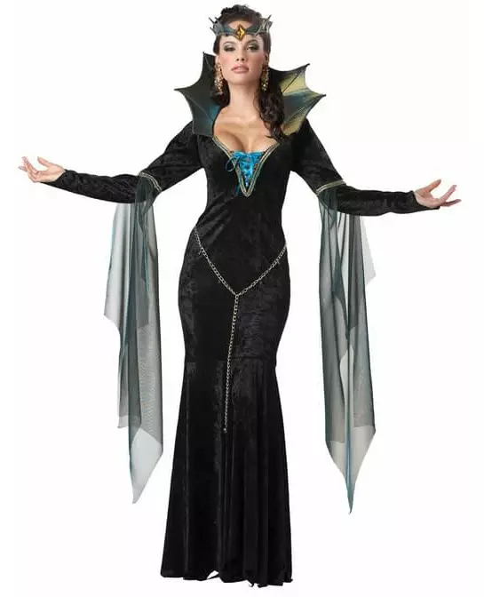 Avslør din onde side Dette onde heksekostymet for kvinner består av en kjole, et hodeplagg og et falskt belte. Den lange kjolen er svart, i et fløyelslignende stoff. Nederdelen av kjolen er litt utsvingt og kuttet i spisser. De lange ermene holdes oppe på én finger med en strikk. Et skinnende blått og gullfarget slør er festet til armene. Blå snøring er også tilstede foran. Den brede kragen er kuttet i en spiss. Den er dekket med et blått og gullfarget slør. Denne kjolen er enkel å ta på seg, uten lukking. En gullkjede med falske blå steiner vil gi illusjonen av at du har på deg et belte. Denne kjeden festes til kjolen i livet med små karabinlåser. Hodeplagget er laget av myk plast. Det er dekorert med en falsk oransje-gul edelsten og holdes på hodet med en strikk. Dette ondskapens gudinne-kostymet vil være perfekt for å avsløre din mørke side til Halloween. Inkludert tilbehør: Kjole Falskt belte Hodeplagg Materiale: 100 % polyester Pleie: Håndvask