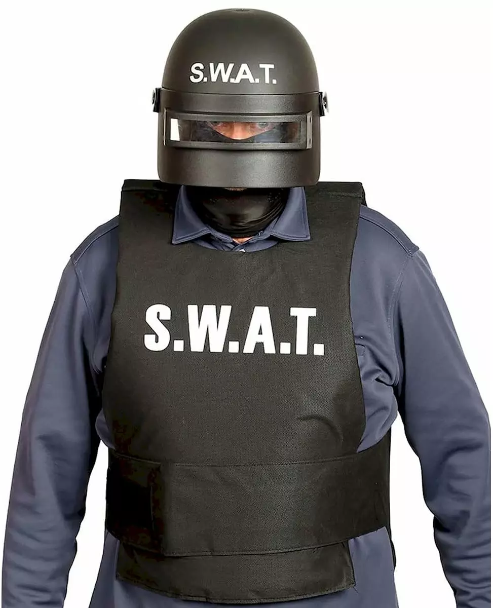 En sjokkpolitibetjent. Denne anti-opprørshjelmen er for voksne. Denne hjelmen er svart med et gjennomsiktig plastvisir i øyehøyde. Denne SWAT-offiserhjelmen vil være perfekt for å fullføre kostymet ditt på dagen eller til en bursdag med temaet uniformer. Inkludert tilbehør: 1 hjelm. Materiale: Plast.