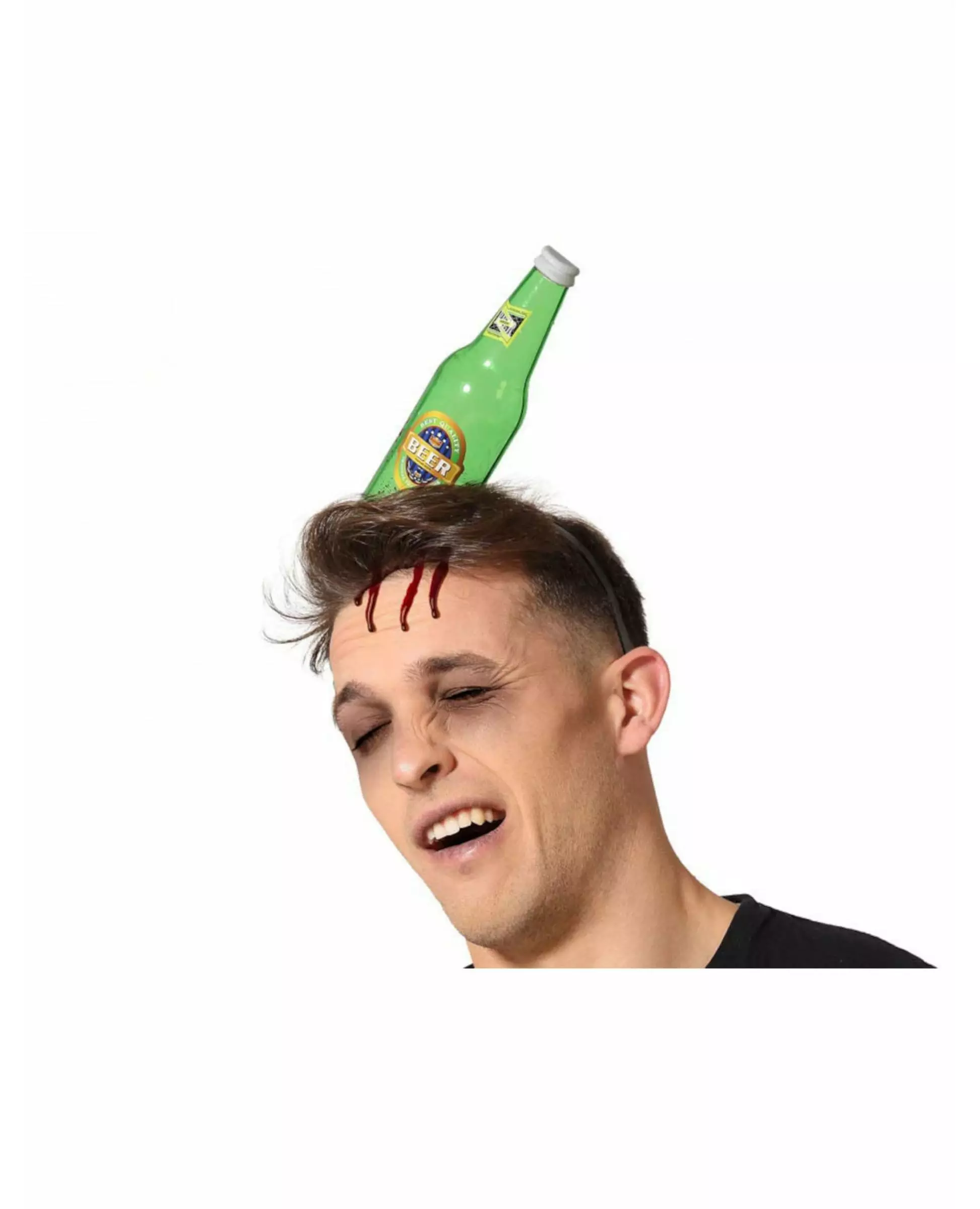 Au! Dette pannebåndet med en knust ølflaske er for voksne. Det består av et svart pannebånd og en falsk grønn, knust ølflaske. Illusjonen vil få de rundt deg til å tro at flasken har blitt knust på hodet ditt! Skaff deg litt falskt blod og passende sminke for mer realisme! Skrekk vennene dine på en skrekkfest eller til Halloween! Inkludert tilbehør: Pannebånd Stell: Ikke vask