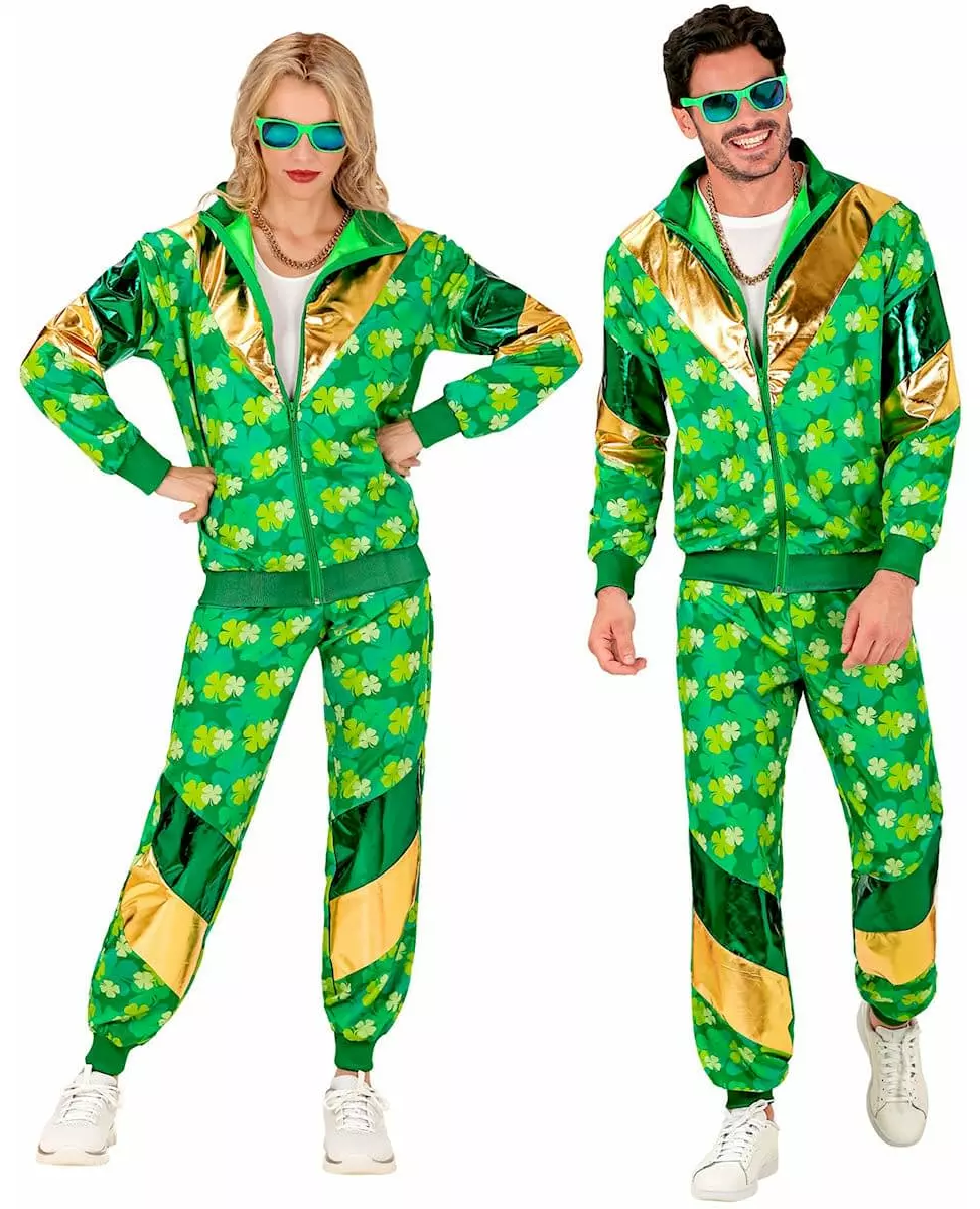 En komfortabel og fargerik St. Patricks dag! Denne kløver-treningsdressen med St. Patricks dag-motiv er for voksne i størrelse. Den består av en jakke og en bukse. Jakken er grønn med kløvertrykk over det hele. Den har gull- og mørkegrønne striper og glidelåslukking foran. Buksene har de samme mønstrene som jakken. Denne kløver-treningsdressen vil være ideell for å feire St. Patricks dag i et komfortabelt antrekk mens du er i temaet! Inkludert tilbehør: Jakke Bukser Materiale: 100 % polyester Vedlikehold: Håndvask