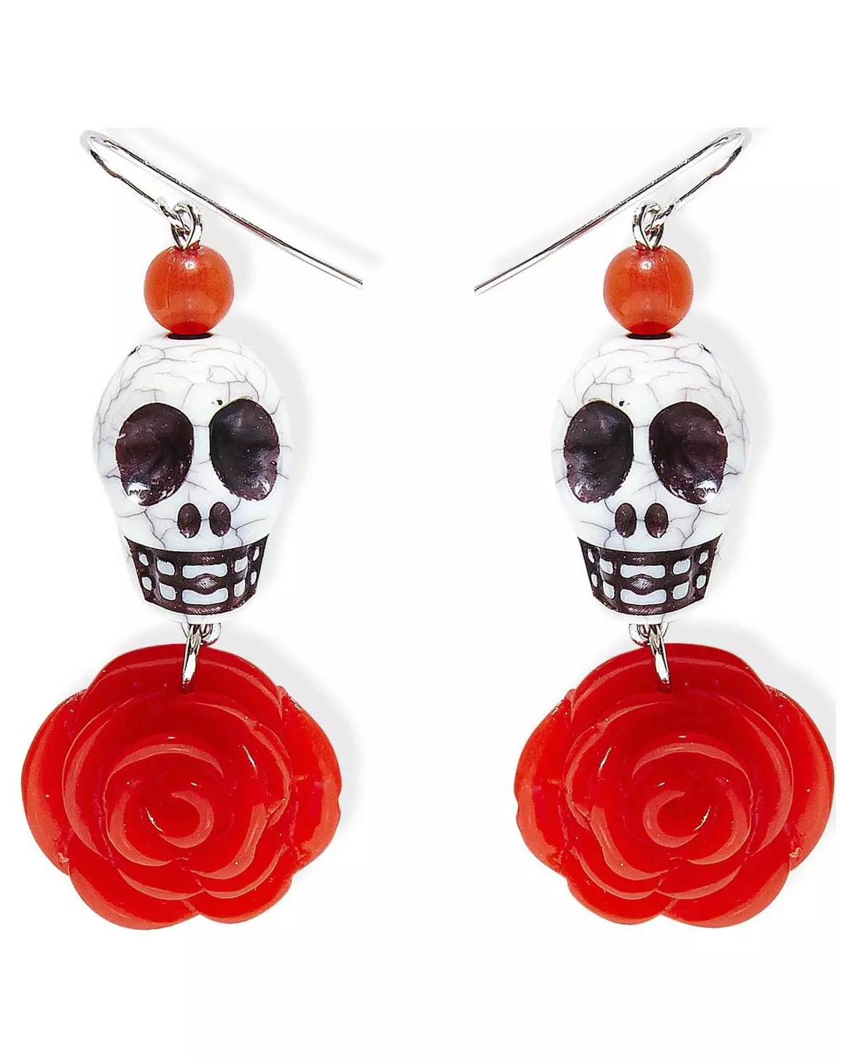 For å feire Halloween, kle deg ut som et fargerikt skjelett. Disse øredobbene for voksne har plasthodeskaller omgitt av perler og røde plastroser. Disse dråpeøredobbene måler omtrent 5 cm i lengde og kan bare brukes hvis du har hull i ørene. De vil være perfekte for å fullføre Calaveras-kostymet ditt til De dødes dag. ©Copyright Widmann SRL. Inkludert tilbehør: 2 øredobber
