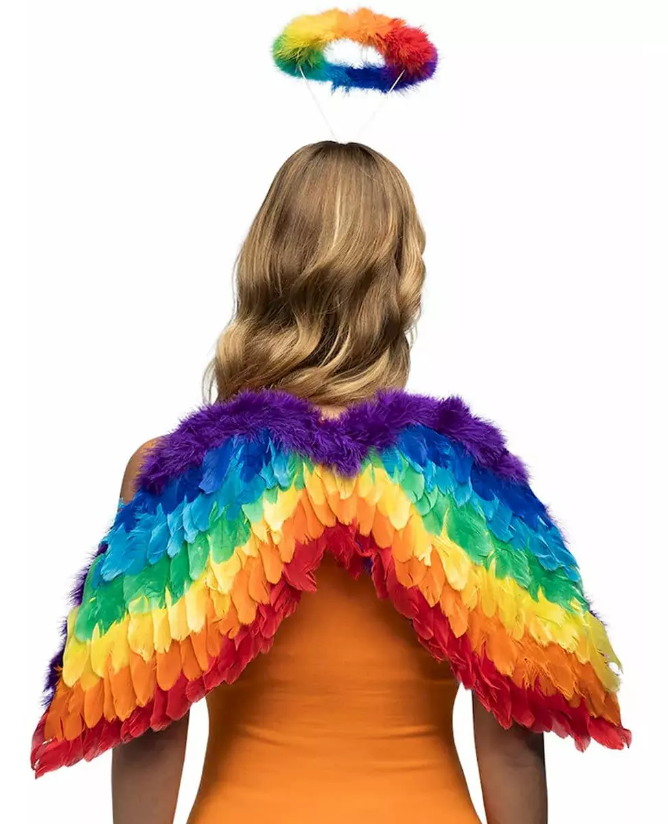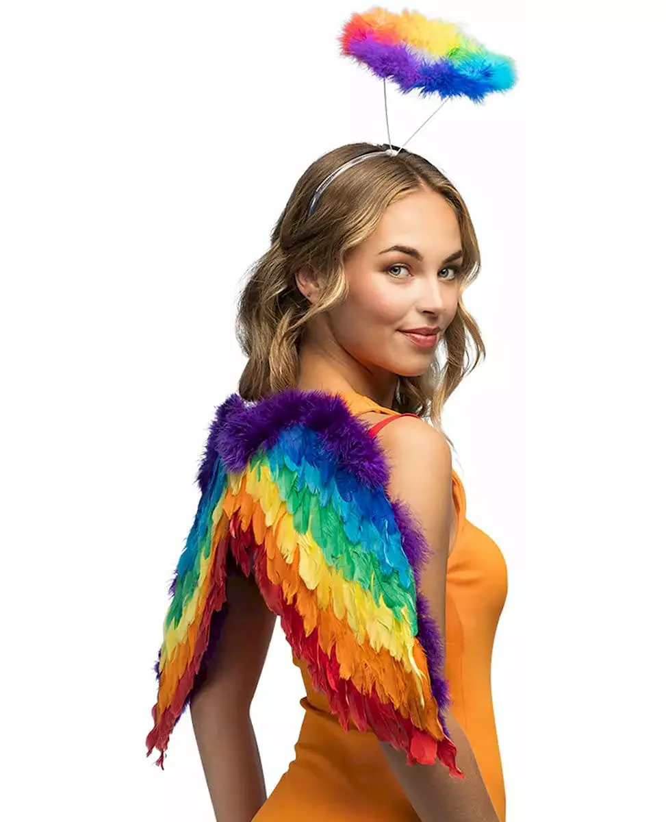 En fargerik engel! Dette regnbueenglesettet for voksne inkluderer et par flerfargede fjærvinger og et matchende pannebånd med en luftig glorie. Vingene måler omtrent 60 x 40 cm og er utsmykket med fjær i sterke nyanser, alt fra lilla til rødt, for en lys og original silhuett. De er enkle å ha på seg takket være diskré strikk. Det metalliske pannebåndet er toppet med en lett regnbueglorie, festet til to fleksible stilker for en myk, svevende effekt. Ideelt for karneval, Pride eller et kostymefest, forvandler dette settet deg til en glad og flamboyant engel, klar til å utstråle godt humør. Inkludert tilbehør: 1 par vinger 1 pannebånd