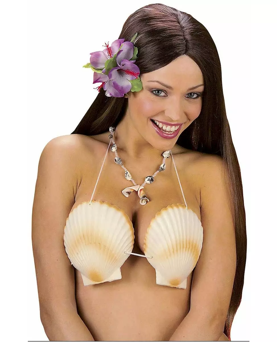 Med lisser! Denne skall-BH-en for voksne er laget av plast. En hvit blonde knyter skallene sammen og knytes bak. Skallet måler 15 cm bredt. Ideell for en fest med Hawaii-tema eller andre temaer. Copyright Widmann SRL.