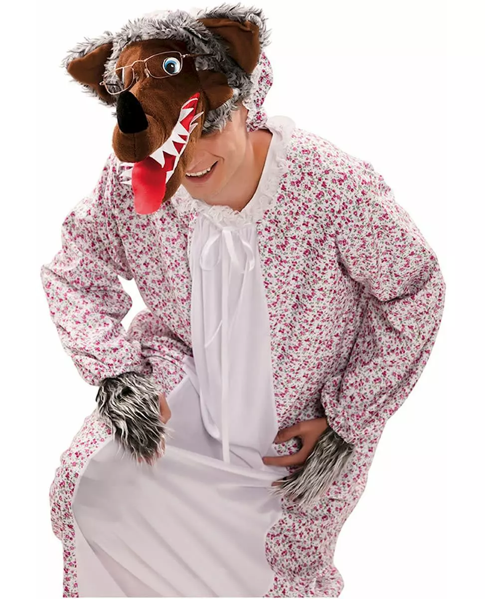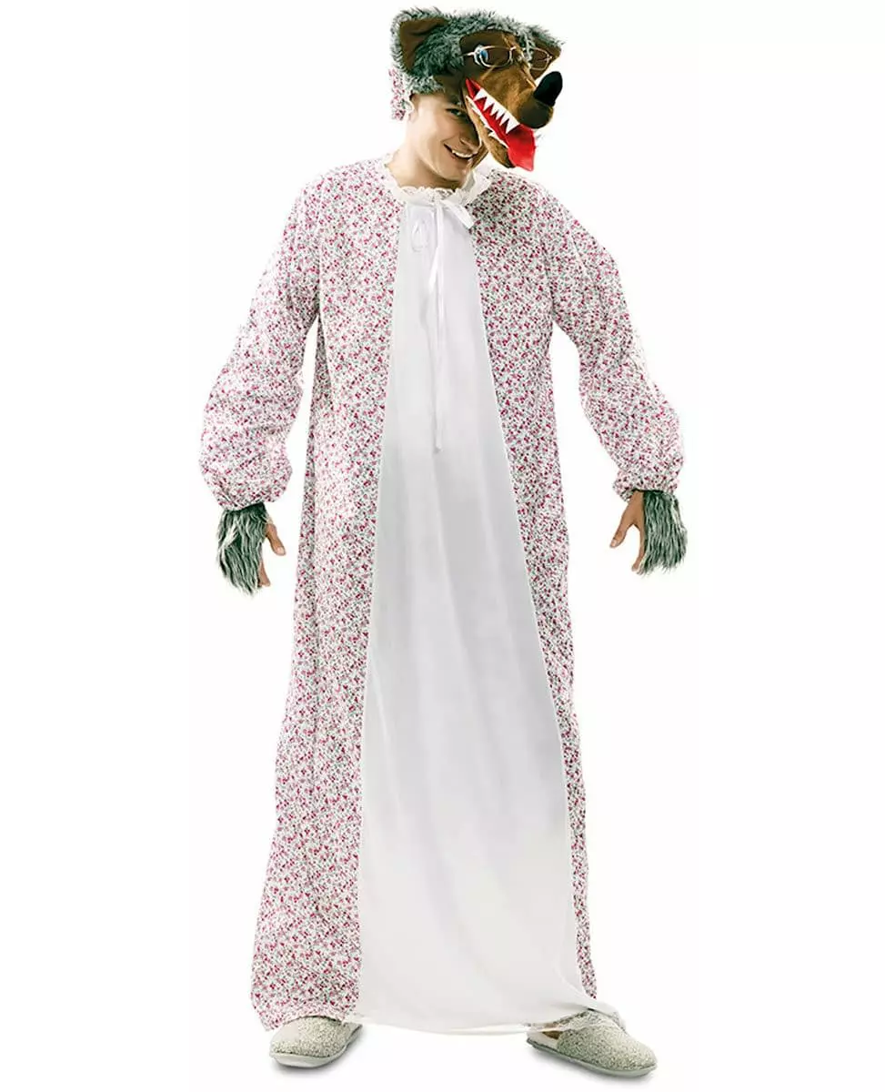 Hvem er redd for den store stygge ulven?! Dette voksne stygge ulvkostymet forkledd som en bestemor inkluderer en nattkjole, en hatt og et par falske hansker. Kjolen er en blomstermønstret nattkjole med hvit front. Det er en tradisjonell eventyrlig bestemornattkjole. Hatten er formet som et ulvehode med grå fuskepels og en stor munn som strekker seg fremover. De falske hanskene vil dekke toppen av hånden din. De er laget av hvitt og grått fuskepelsstoff. Dette komplette ulvekostymet forkledd som en bestemor vil være perfekt for en fest med eventyrtema. Inkludert tilbehør: Kjole, Ulvehatt, Hansker, Materiale: 100 % polyester,