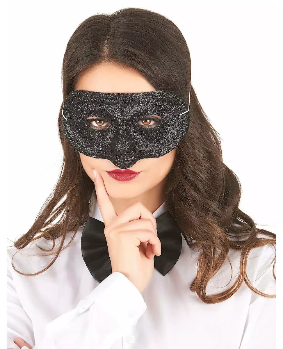 Denne masken er for voksne. Den er dekket av glitter, er svart og festes til ansiktet med en strikk. Den måler 20 cm lang og 9 cm høy. Med godt sminket øyne vil denne masken bare forsterke antrekket ditt på en temafest eller til karneval! Inkludert tilbehør: Maske,