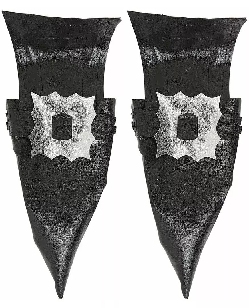 Bli en ekte heks fra topp til tå! Disse hekseovertrekksskoene med skinneffekt for voksne har en spiss form foran på foten. De har en bred svart flik på toppen og en falsk sølvspenne. De vil skjule forsiden av føttene dine. De vil enkelt holde seg fast bak på hælen takket være to strikker. Disse overtrekksskoene vil være det perfekte supplementet til heksekostymet ditt, og gå på knask-eller-treat med barna dine på Halloween-kvelden. Copyright Widmann SRL. Inkludert tilbehør: 2 overtrekkssko Materiale: 100 % syntetisk skinn