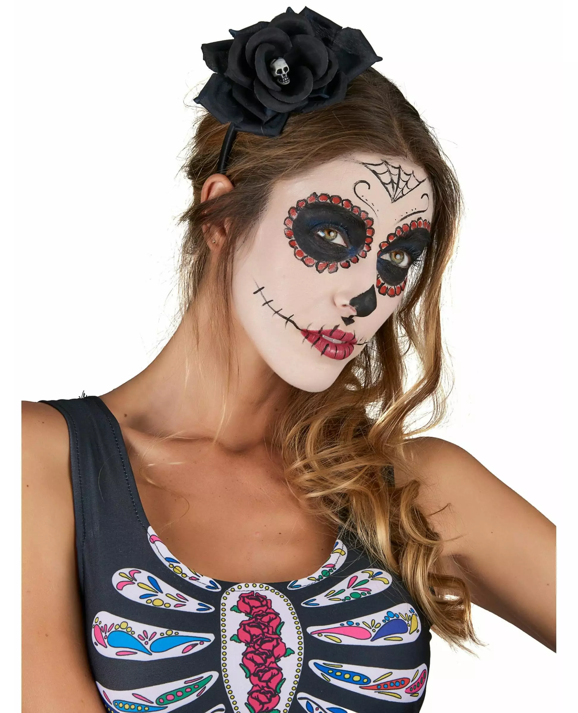 For en skjønnhet! Dette myke pannebåndet for voksne er svart og har en stor svart stoffrose dekorert med en liten hodeskalle i midten. Dette vakre hårpynten vil være ideell for Halloween eller andre temafester!. Inkludert tilbehør: Pannebånd Materiale: Plast og polyester