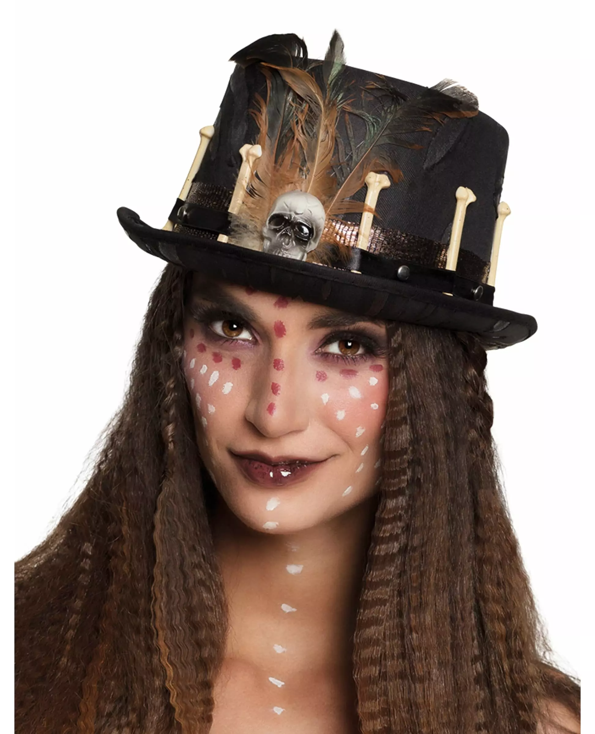 Klar for en voodoo-hekseøkt? Denne voodoo-flosshatten er for voksne. Denne flosshatten er svart. Den har en skinnende kobberflette omgitt av bein og festet til hatten med en svart stropp i skinnimitasjon. I midten sitter en hodeskalle, i en gradient fra hvitt til grått, utsmykket med tre falske fjær. Takket være denne hatten er voodoo-heksekostymet ditt komplett, slik at du er klar til å gå inn i hekseriets magiske verden til Halloween eller en heksefest! Inkludert tilbehør: Hatt Materiale: 100 % polyester 100 % polyester