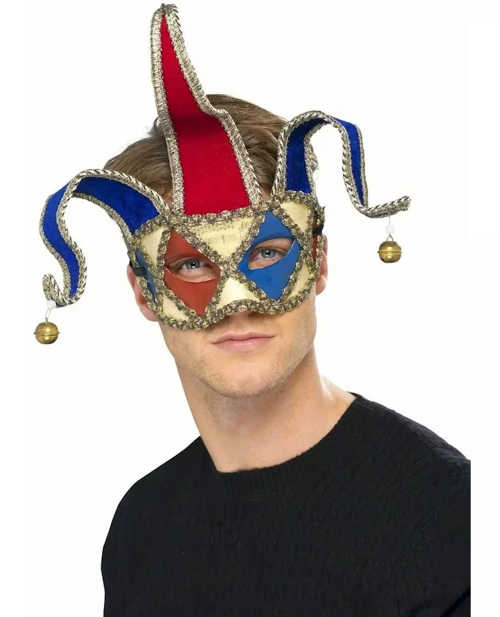 Med 3 bjeller for å lage lyd! Denne venetianske narremasken dekker den øvre delen av ansiktet og festes bak ved å knyte to 1 cm brede, svarte snorer. De siste finpussene er presise, en flette er limt til alle maskens konturer, og 3 fliker fremhever narreånden til tilbehøret. Disse 3 flikene er laget av en slags fløyel, de er formbare, og 3 bjeller henger fra enden for å lage lyd. Denne masken er ideell for å gjenskape en forkledning verdig verdens største karneval.