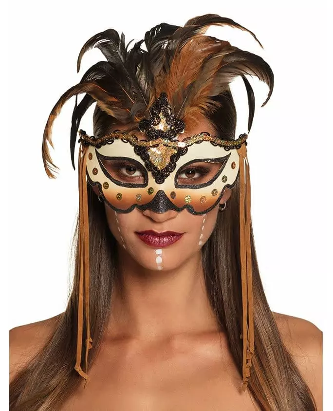 Klar for et voodoo-ritual! Denne mamba voodoo-ulven er for voksne. Toppen av masken er toppet med en fjærplumme av brune fjær. På pannen pryder gullfargede paljetter ulven. Frynser som imiterer lær faller på hver side av masken. Omrisset av øynene og bunnen av ulven er fremhevet med brune glitrende kanter. Store paljetter med gulldetaljer pryder undersiden av øynene. Dette tilbehøret vil sette prikken over i-en på voodoo-heksekostymet ditt til Halloween. Inkludert tilbehør: Ulv, Materiale: Plast Plast,