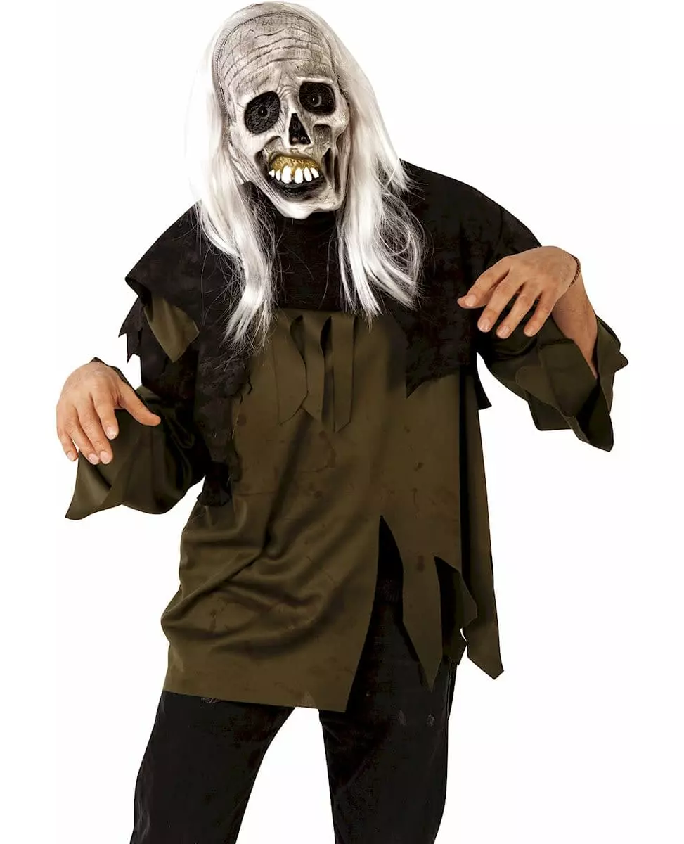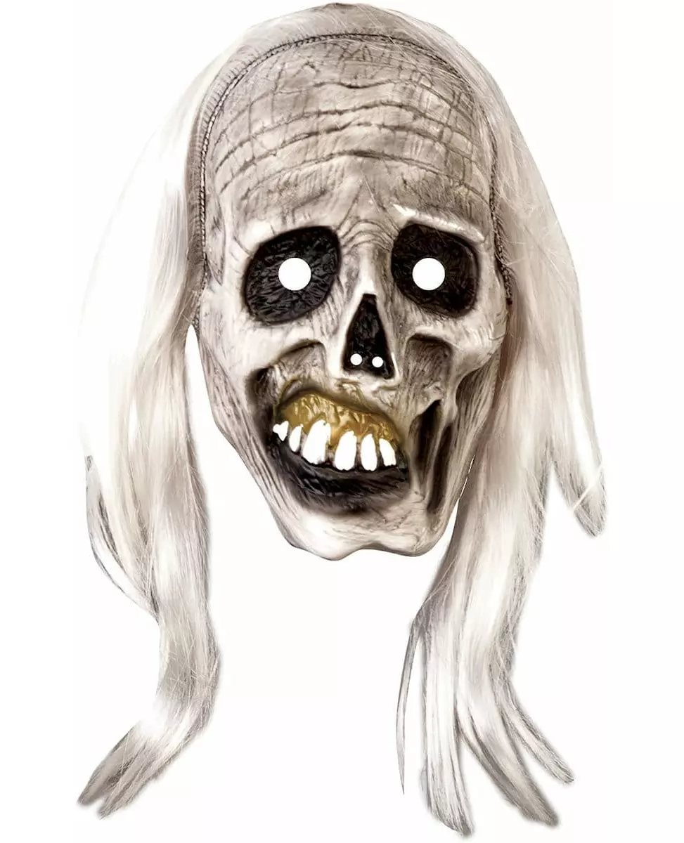 En sublim maske Dette settet består av en maske med parykk for voksne (toppen er ikke inkludert). Denne masken forestiller hodet til en zombie med råtne tenner og tannkjøtt. En lang hvit parykk er sydd direkte på masken for å gi enda mer realisme! Den perfekte zombiemasken for å fullføre antrekket ditt og legemliggjøre de berømte zombiene fra en berømt TV-serie under Halloween! Materiale: PVC-maske. Inkludert tilbehør: PVC-halvmaske