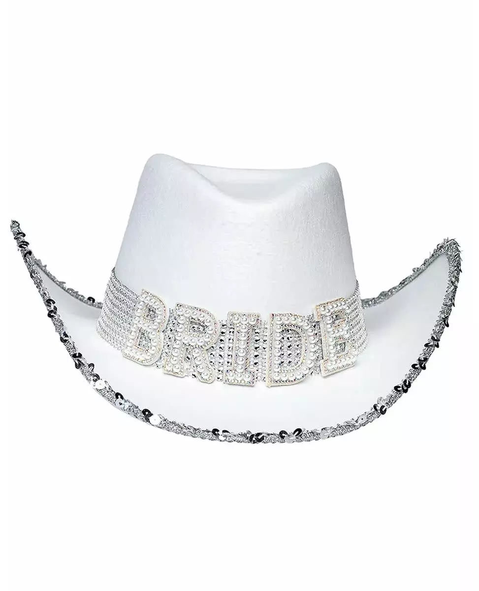 Den vordende bruden i western-stil! Denne cowboyhatten for voksne er det perfekte tilbehøret for en brud som ønsker å skinne med stil. Med sitt elegante hvite design, glitrende strass og «Bride»-skrift utsmykket med glitter, gir den antrekket ditt et morsomt og glamorøst preg. Den hevede bremmen dekorert med strass gir en fin og glitrende finish. Perfekt for et utdrikningslag med originalitet! Inkludert tilbehør: 1 hatt
