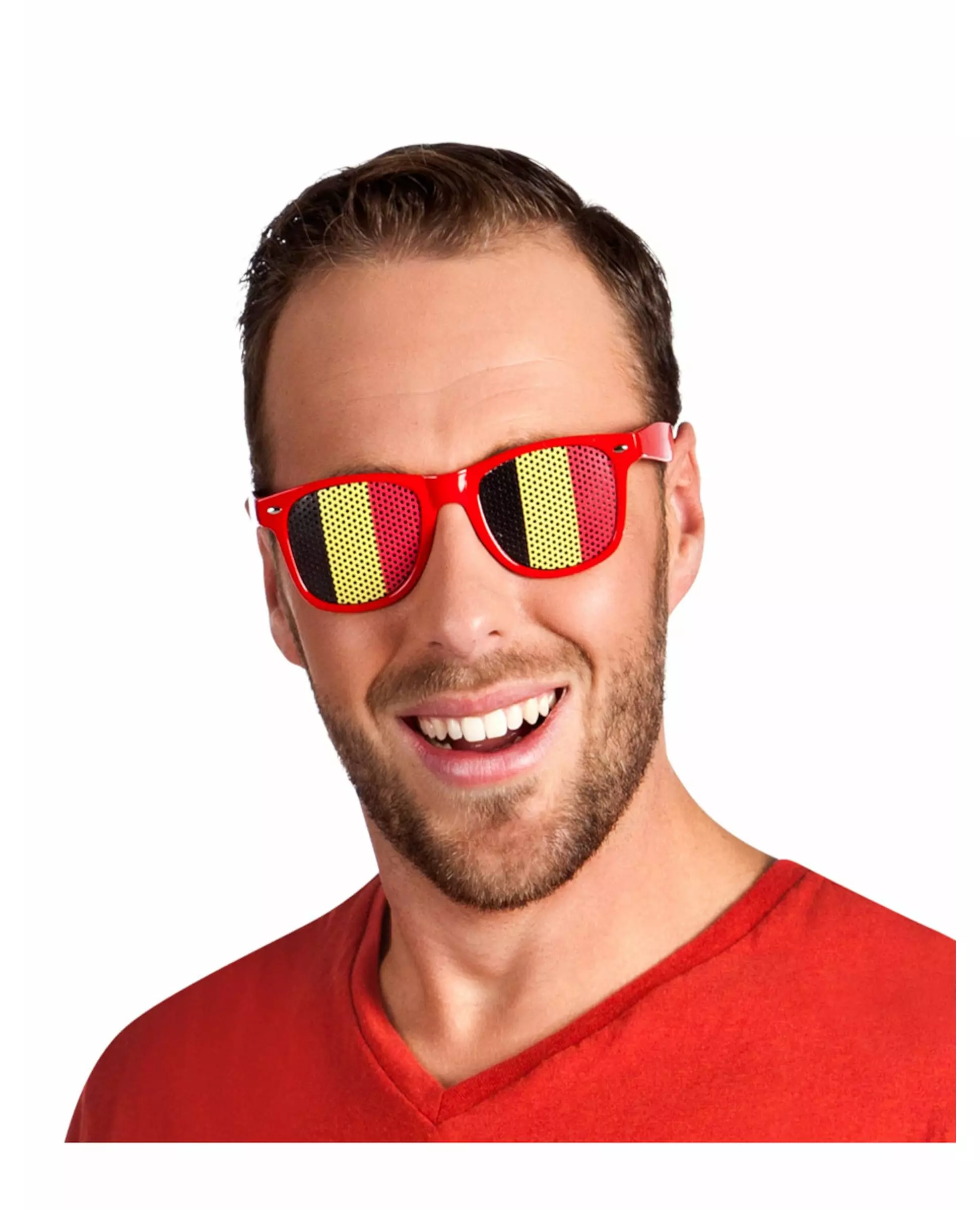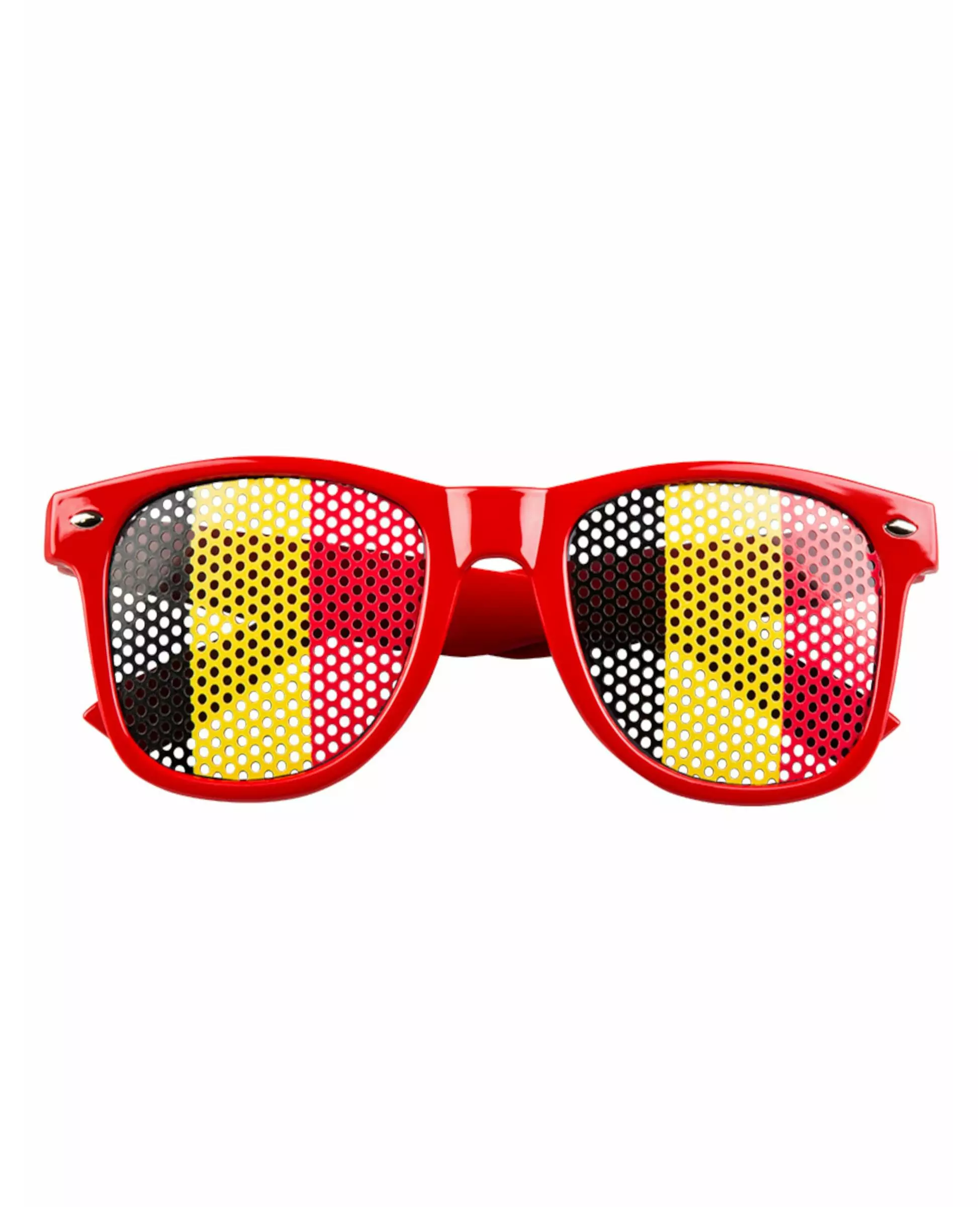 Støtt Belgia til øyetippene! Disse supporterbrillene er for voksne. De er laget av plast med rød innfatning. Klistremerker i fargene til det belgiske flagget er festet på linsene. De har en rekke perforeringer som gjør at du enkelt kan se gjennom dem. Brillenes innfatning måler omtrent 14,5 cm. Disse brillene vil være perfekte for å fullføre ditt belgiske supporterantrekk under sportsbegivenheter som VM eller EM! Inkludert tilbehør: 1 par briller Materiale: Plast Stell: Håndvask