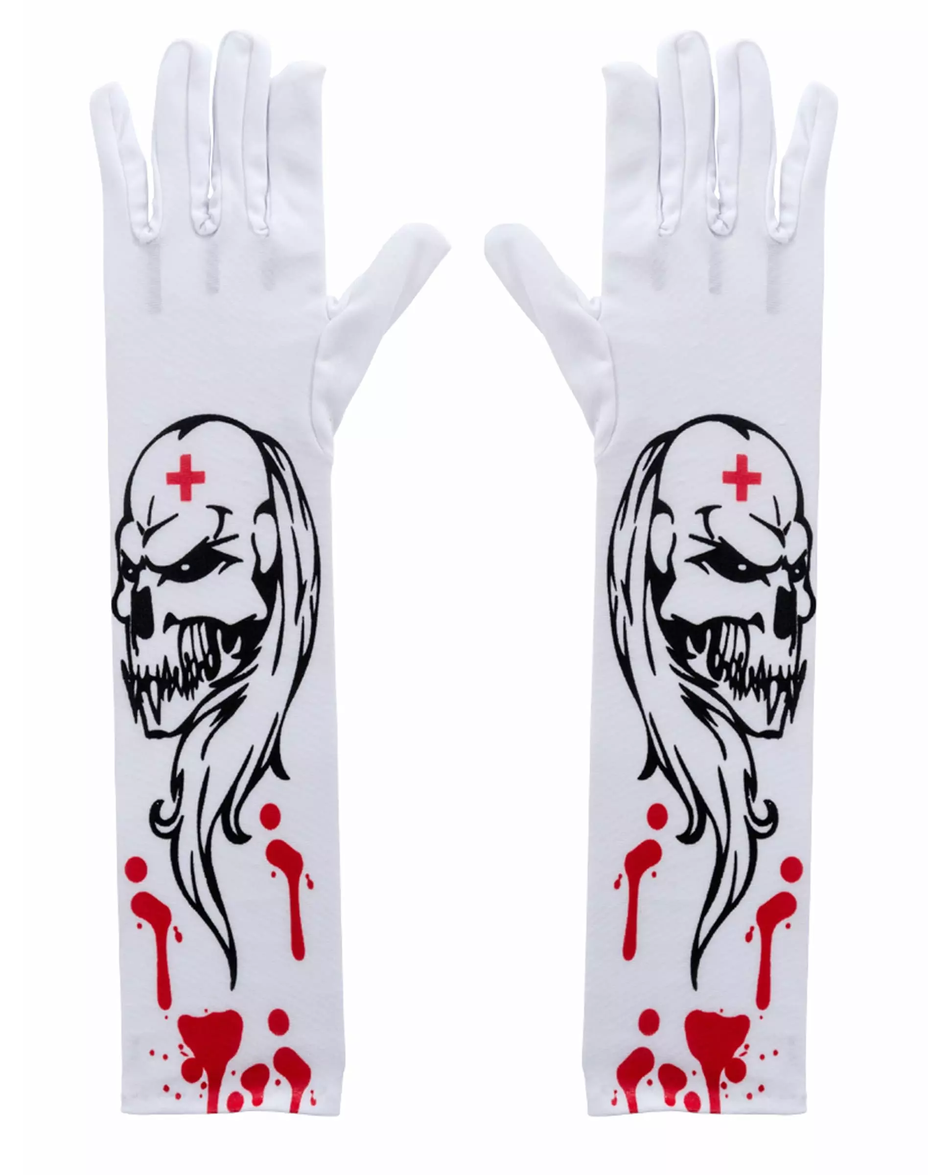 Et tilbehør verdig en skrekkfilm. Dette hanskeparet er for voksne. Disse hvite hanskene er mellomlange. De er trykt med et zombiehode med langt hår og et rødt kors. Falske blodflekker. Disse hanskene vil være perfekte for å pynte opp Halloween-kostymene dine. Inkludert tilbehør: 2 hansker. Materiale: 100 % polyester. Vedlikehold: Håndvask.