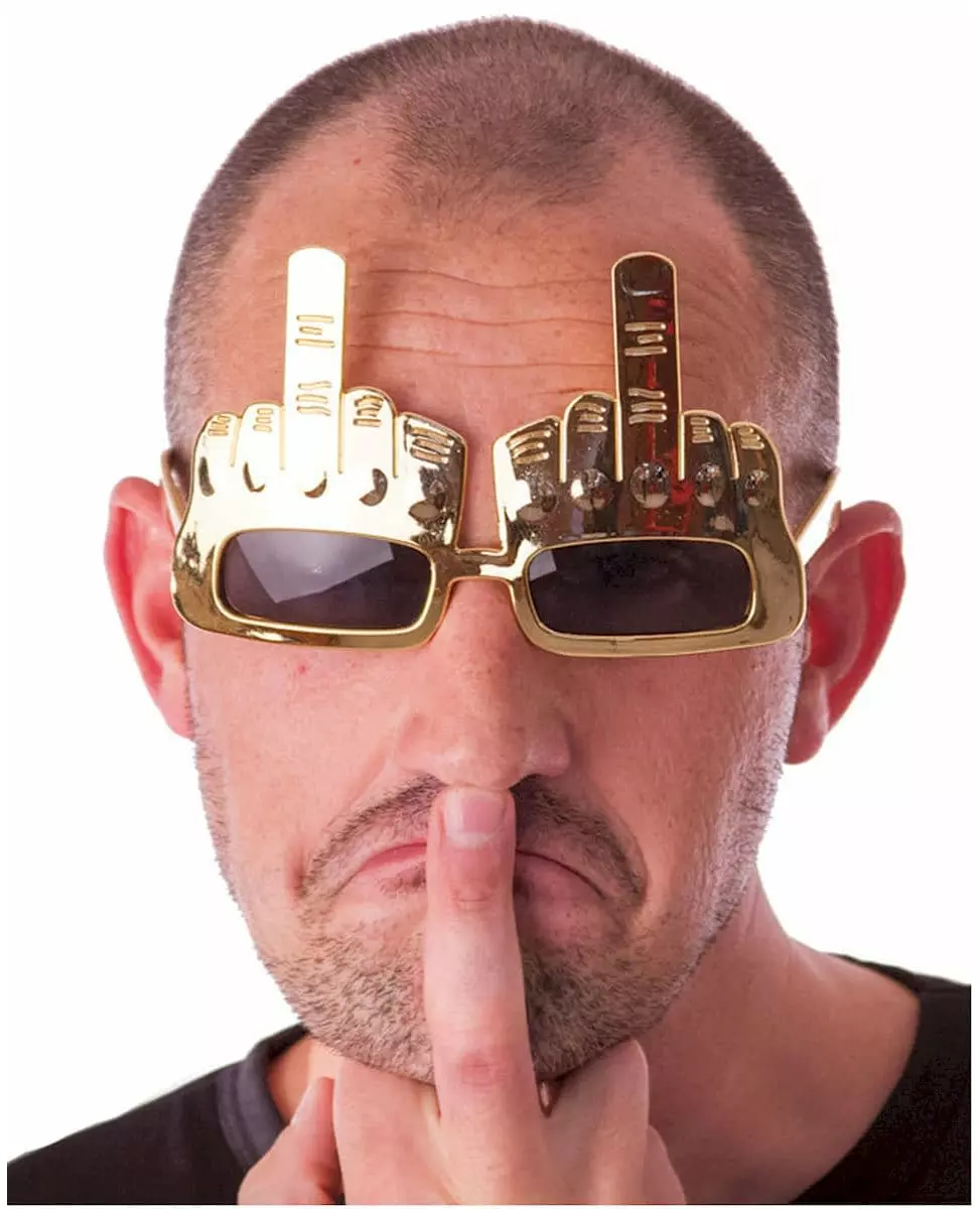 Publikummet ditt vil ta det godt imot! Disse finger-up-brillene i plast er designet for voksne. De har en gullfarget innfatning og svarte plastlinser. De måler omtrent 15 cm i bredden, og stengene måler omtrent 13,5 cm lange. Disse fingerbrillene vil være ideelle for en humoristisk fest med venner! Inkludert tilbehør: 1 par briller Materiale: Plast