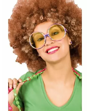Briller med 6 cm diameter! Hippiebriller for voksne med rosa, lilla, grønne og hvite striper. Linsene er 6 cm i diameter og tonet gule. Et fargerikt tilbehør, ideelt for å fullføre hippiekostymene dine eller andre morsomme og fargerike kostymer.