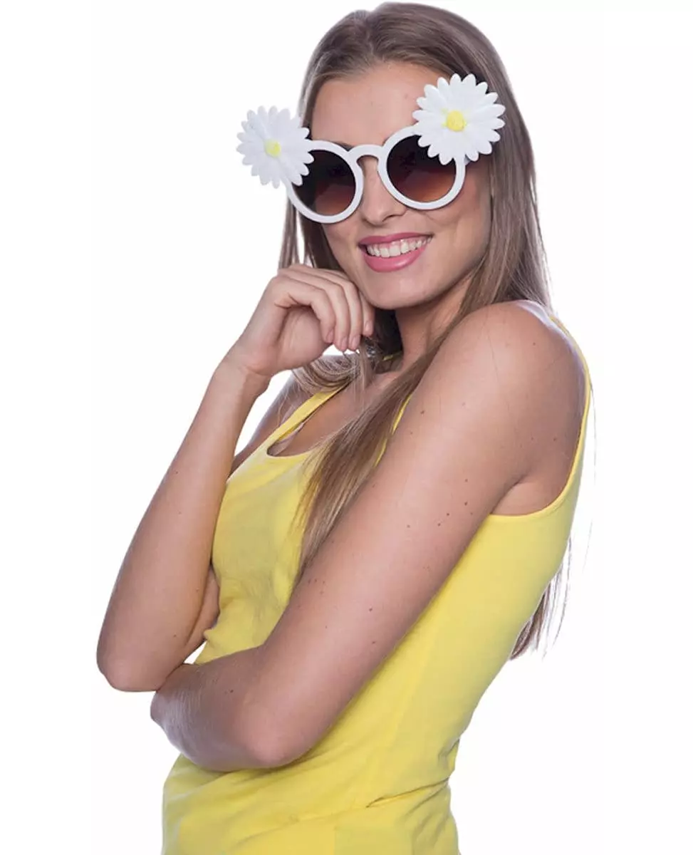 Tusenfrydbriller for en bohemsk kveld! Disse hippie-/bohembrillene er for voksne. De er hvite i fargen og runde i formen, har tonede linser og er dekorert med en hvit og gul tusenfryd på hver kant. Disse hvite tusenfrydbrillene vil fullføre et 70-talls flower power-hippiekostyme under karneval, festival eller en 70-tallsfest på en original måte. Inkludert tilbehør: 1 par briller Materiale: Plast Stell: Håndvask