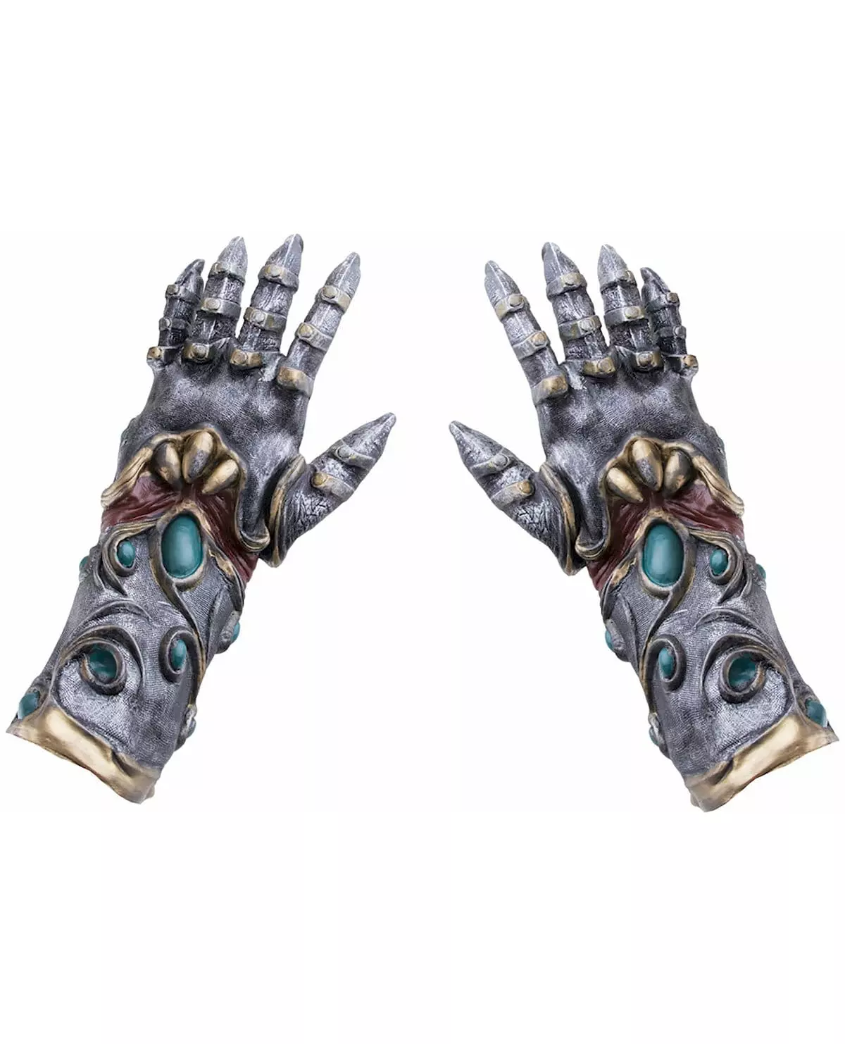 Kast ned hansken! Disse latekshanskene vil gi illusjonen av at du har på deg ridderhansker. De er stålgrå og dekorert med gull. Disse krigerhanskene vil fullføre antrekket ditt til neste kostymefest. Inkludert tilbehør: et par hansker Materiale: Lateks