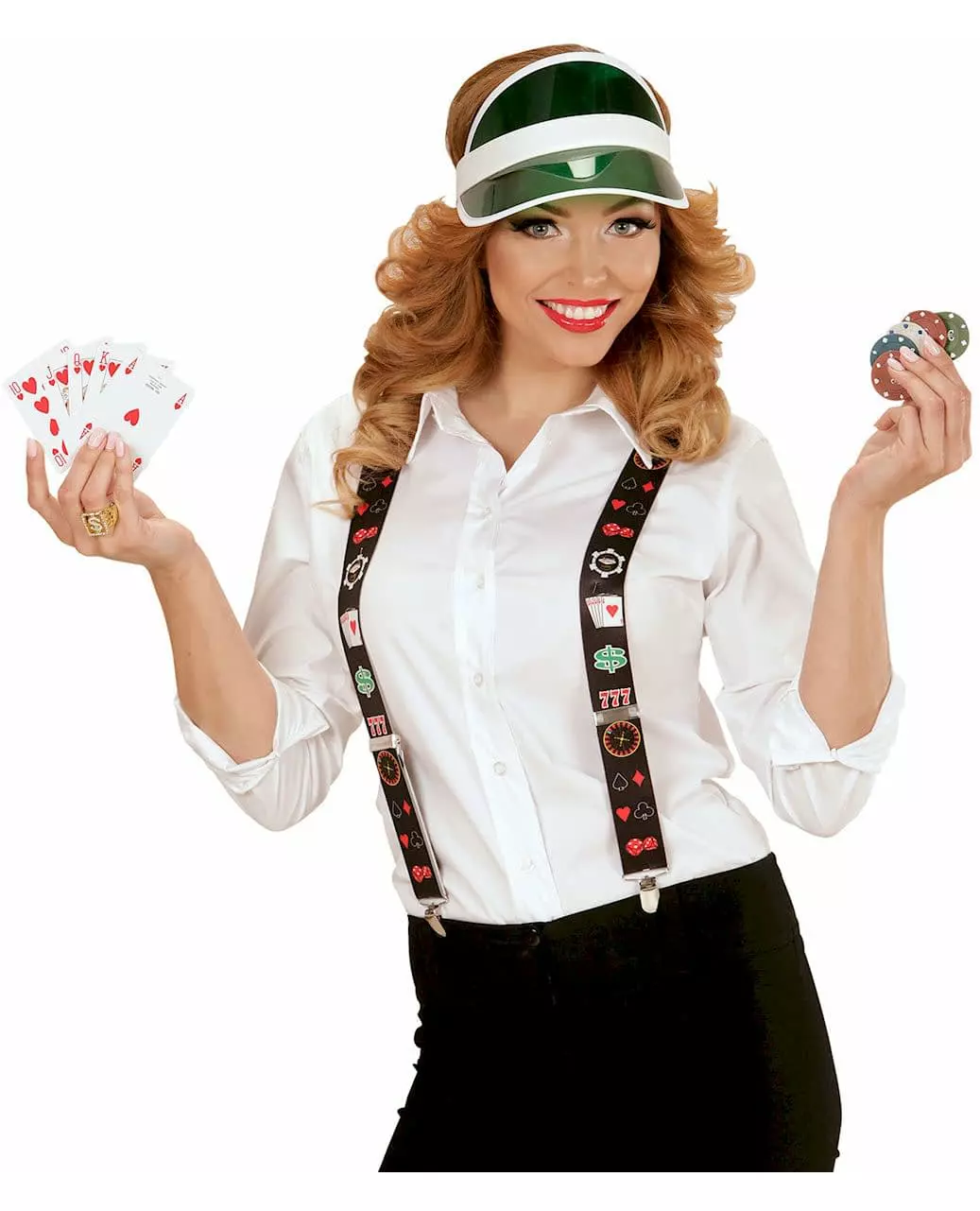 Det er din tur! Disse spandex-selene er for voksne. De er svarte og har mønstertrykk med poker- og kasinotema. Disse justerbare selene er krysset bak og har et klipsfestesystem. Disse selene vil være det essensielle tilbehøret for å fullføre antrekket ditt på en kveld med Las Vegas-, poker- eller kasinotema. Copyright Widmann SRL. Inkludert tilbehør: 1 par seler Materiale: - Spandex Spandex Spandex