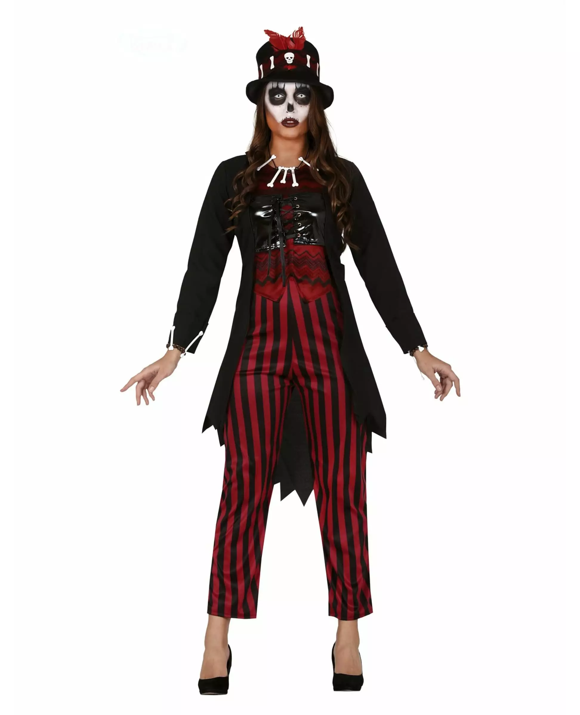 Et voodoo-heksekostyme til Halloween! Dette voodoo-heksekostymet for kvinner består av en hatt, en jakke, et korsett og bukser. Jakken er svart, lang og dekorert med hvite bein. Buksene har røde og svarte striper. Den røde vesten har svarte chevronmønstre og kommer med et skinnende svart korsett. Den svarte hatten er dekorert med et rødt bånd med bein, en hodeskalle og røde fjær. Dette voodoo-heksekostymet vil være perfekt for å feire Halloween eller De dødes dag med venner! Inkludert tilbehør: Hatt, jakke, skjorte, korsett, bukser Materiale: 100 % polyester