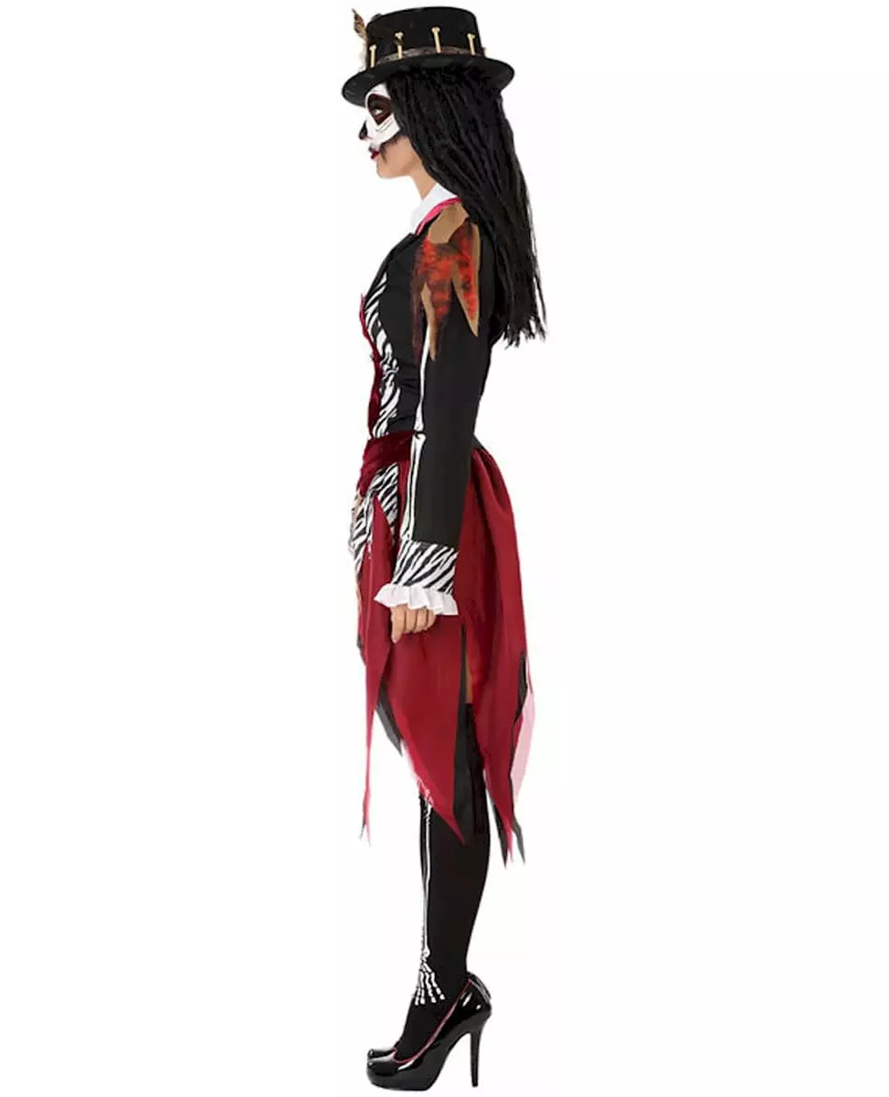 Forhekset! Dette voodooheksekostymet for kvinner består av en tunika og et skjørt (hatt, septer, strømper og sko er ikke inkludert). Den langermede tunikaen er en imitasjonsjakke med en dobbel rad med falske hodeskalleknapper. I midten er den laget av burgunderfarget imitert fløyelsstoff. Den har også en rekke innlegg med sebra- eller dyrehudmønstre. Og for en elegant voodooheksestil har toppen en pen hvit skjortekrage. Skjørtet er laget av svart stoff foret med et burgunderfarget slør. Det har et falskt belte laget av biter av dyrehudlignende stoff. Det er kuttet til en spiss for en enda mer skremmende stil. Med dette voodooheksekostymet kan du velge en original forkledning som ikke vil gå ubemerket hen på Halloween-kvelden. Inkludert tilbehør: Tunika Skjørt Materiale: 100 % polyester Stell: Håndvask