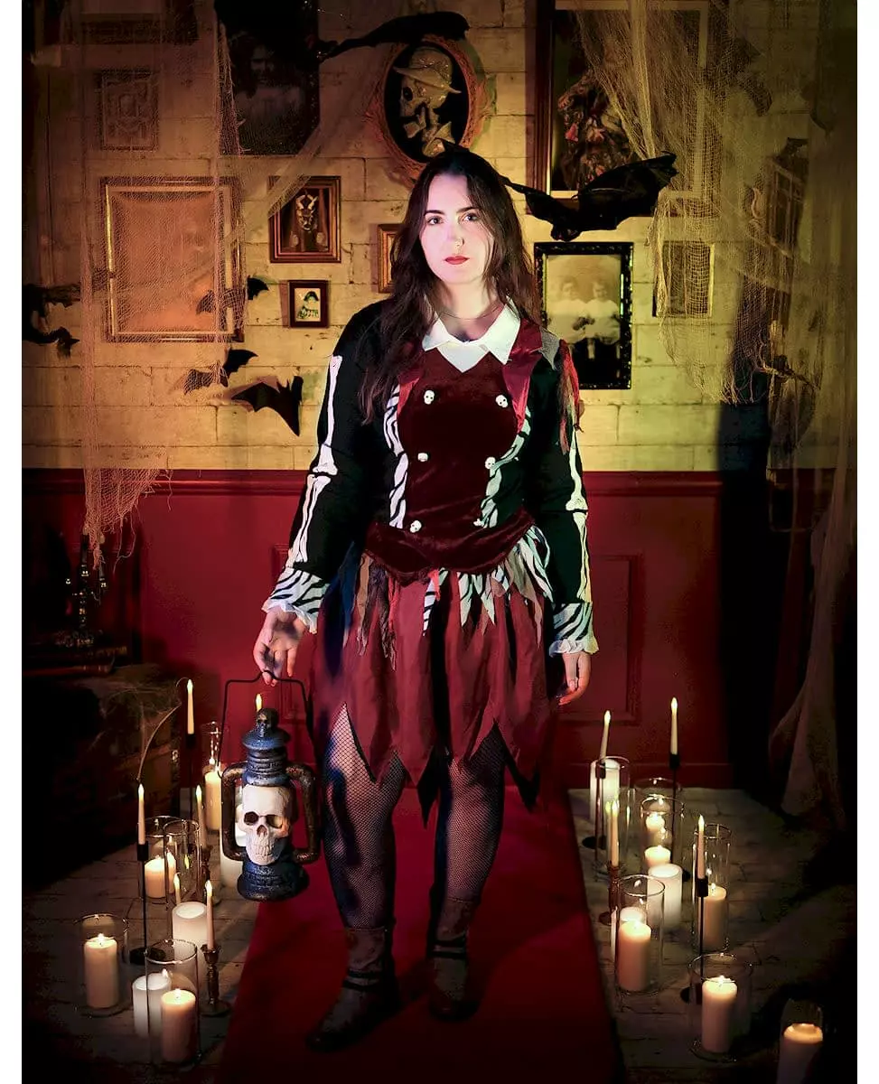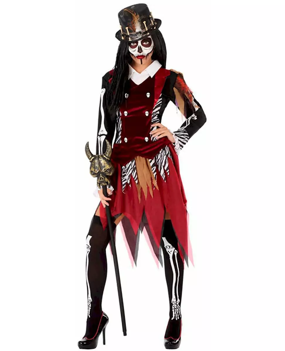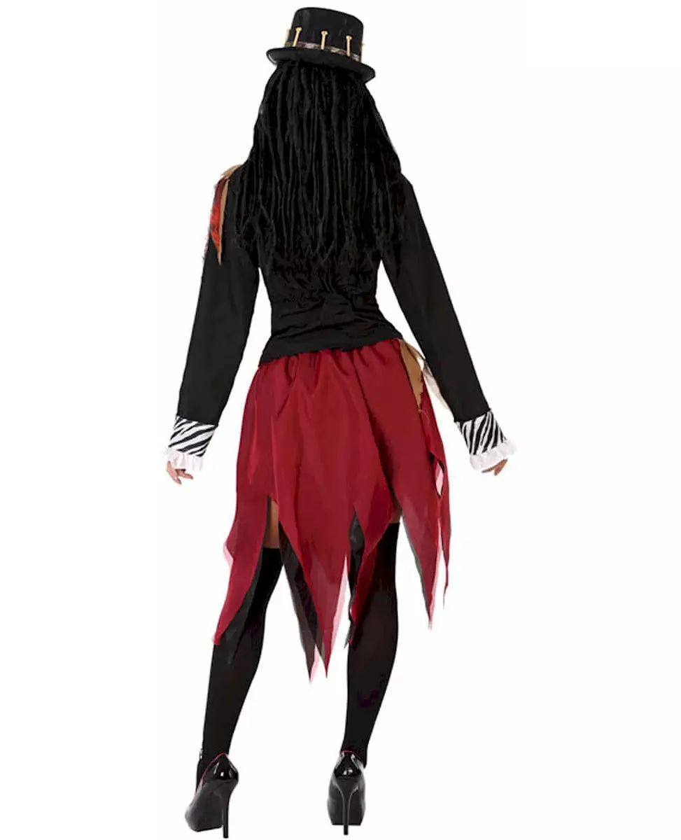 Forhekset! Dette voodooheksekostymet for kvinner består av en tunika og et skjørt (hatt, septer, strømper og sko er ikke inkludert). Den langermede tunikaen er en imitasjonsjakke med en dobbel rad med falske hodeskalleknapper. I midten er den laget av burgunderfarget imitert fløyelsstoff. Den har også en rekke innlegg med sebra- eller dyrehudmønstre. Og for en elegant voodooheksestil har toppen en pen hvit skjortekrage. Skjørtet er laget av svart stoff foret med et burgunderfarget slør. Det har et falskt belte laget av biter av dyrehudlignende stoff. Det er kuttet til en spiss for en enda mer skremmende stil. Med dette voodooheksekostymet kan du velge en original forkledning som ikke vil gå ubemerket hen på Halloween-kvelden. Inkludert tilbehør: Tunika Skjørt Materiale: 100 % polyester Stell: Håndvask