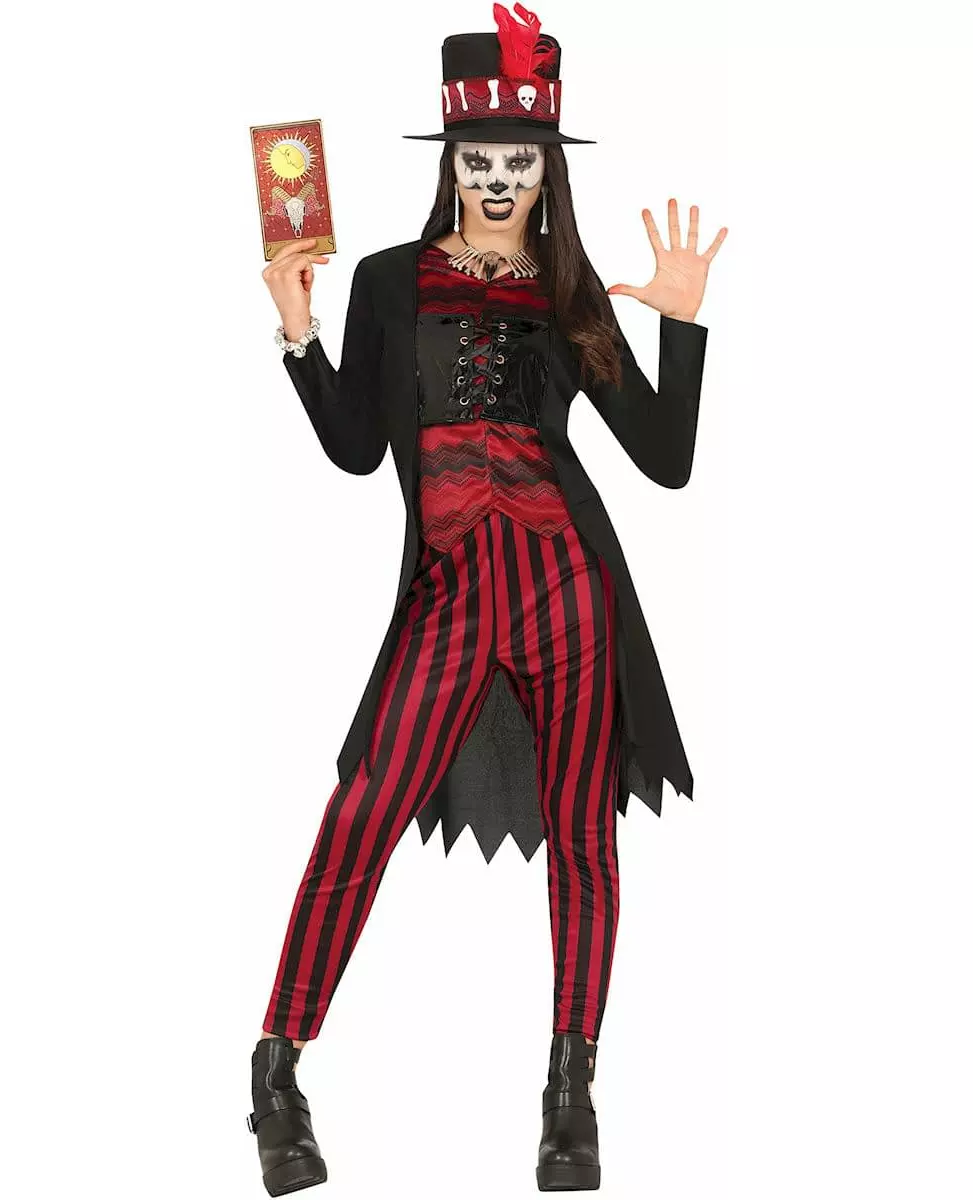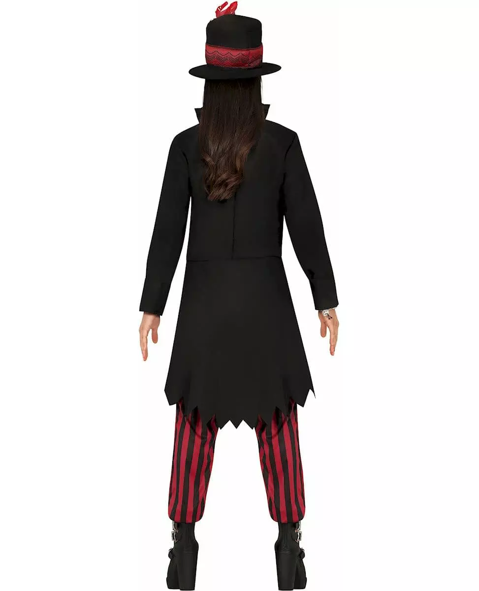 Dykk ned i voodoo denne Halloween! Dette voodooheksekostymet for tenåringer inkluderer en flosshatt, skjorte, korsett, bukser og jakke for et utseende som er både mystisk og fengslende. Den asymmetriske svarte jakken, lang bak og kort foran, tilbyr en dristig stil med sine utskårne kanter som gir den et slitt og autentisk utseende. Under jakken gir den røde skjorten med svarte striper, kombinert med et svart korsett med alderen, et elegant preg til ensemblet. De matchende buksene. De røde og svarte stripene fullfører antrekket perfekt, og gir det et elegant, men likevel skummelt utseende. Den svarte flosshatten, utsmykket med røde detaljer og voodoo-motiver, gir en uhyggelig og raffinert finish. Dette voodooheksekostymet er ideelt for de som ønsker å dykke ned i hjertet av mystiske ritualer under Halloween. Med dette kostymet kan du la deg fortrylle av svart magi og unne deg mystiske ritualer med stil. Materiale: Polyester. Inkludert tilbehør: 1 hatt 1 skjorte 1 korsett 1 bukse 1 jakke