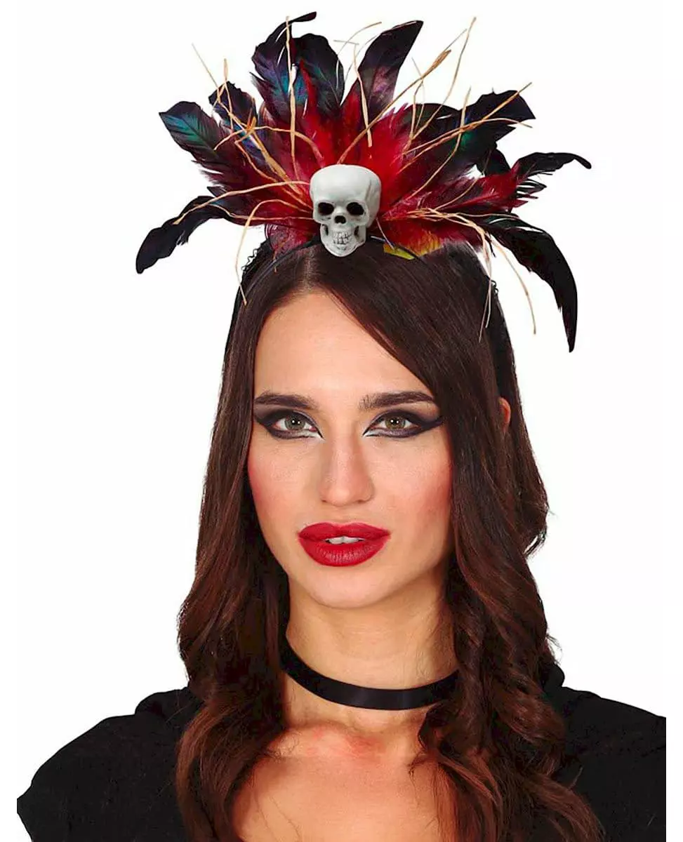 Et perfekt hodeplagg for en voodoo-heks! Dette voodoo-heksepannebåndet er for kvinner. Dette voodoo-pannebåndet er dekorert med pene, svarte fjær med iriserende detaljer og pene, kortere røde og gule fjær. Til slutt er det en hvit hodeskalle i midten som minner om voodoo-ritualer og -seremonier. Dette pannebåndet vil være et perfekt tilbehør til voodoo-trollmannskostymet ditt til Halloween. Inkludert tilbehør: Pannebånd