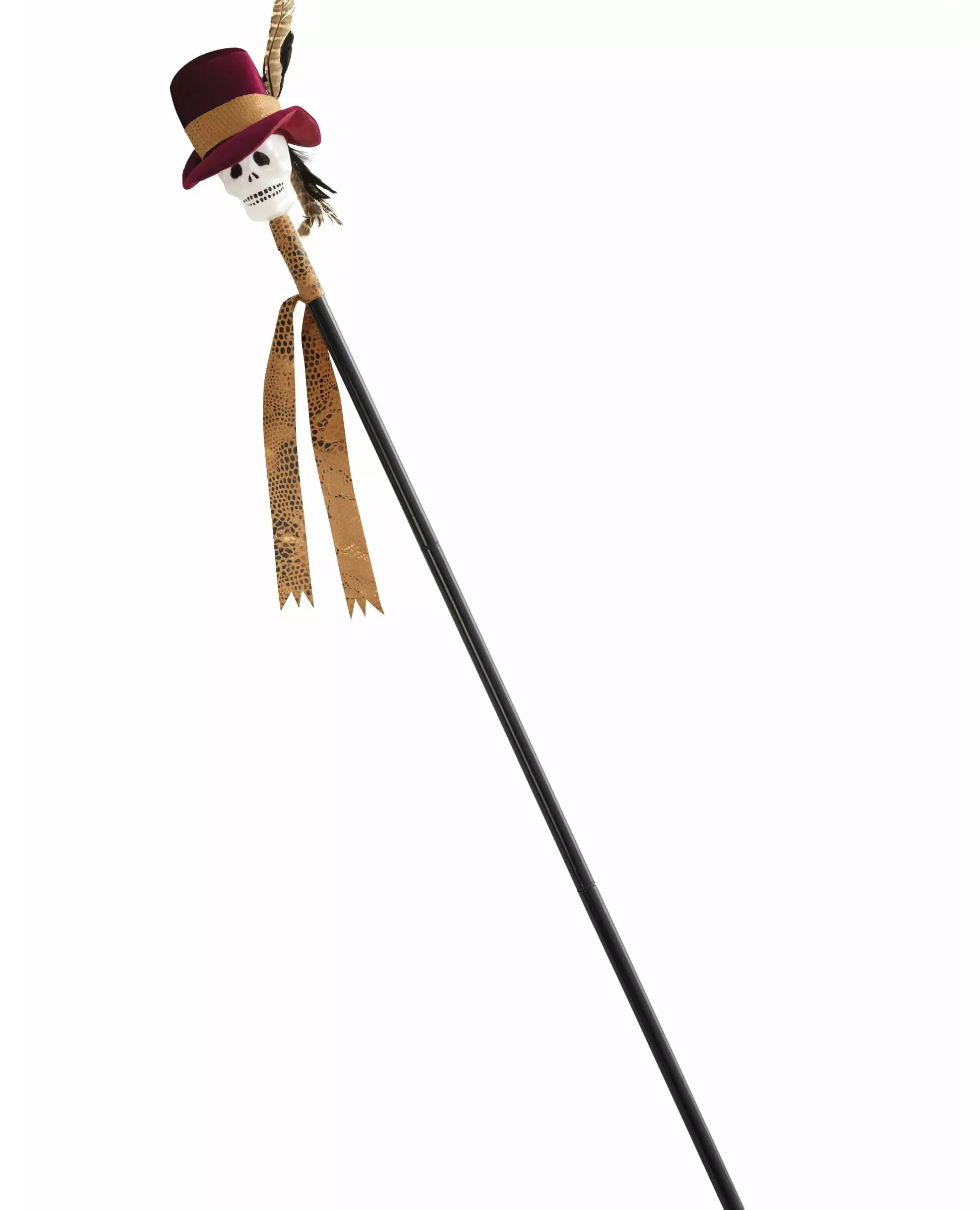 En lengde på 120 cm! Dette tilbehøret er en voodoo-stokk. Den er svart og dekorert med et hvitt skjeletthode med en burgunderrød hatt. Den har også et pent trykt stoff i beige toner og to fjær. Den måler omtrent 120 cm. Den leveres til deg i fire deler for montering. Denne stokken vil ideelt sett fullføre voodoo-kostymet ditt på en kostymefest! Inkludert tilbehør: Voodoo-stokk Materiale: Plast